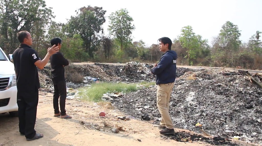 ขณะที่ฝ่ายสอบสวน สภ.แวงน้อย ลงพื้นที่ตรวจสอบที่เกิดเหตุอย่างละเอียด เช่น เส้นทางเข้าออกบ่อขยะ สภาพแวดล้อมที่เกิดเหตุ เพื่อใช้ประกอบสำนวนการสอบสวน โดยนายเชิดชาย นาคุณ ผู้ช่วยผู้ใหญ่บ้าน ยืนยันว่า บริเวณเกิดตุมีชาวบ้านเข้ามาเขี่ยหาของเก่าไปขายอยู่เรื่อยๆ รวมทั้งเข้ามาหาของป่า หลังจากที่ทางรถขยะของ อบต. นำขยะจากหมู่บ้านต่างๆ มาทิ้ง แต่ก็ไม่มีใครพบเห็นโครงกระดูกนี้ อีกทั้งคนที่จะรู้จักว่าจุดนี้เป็นบ่อขยะจะมีเฉพาะคนในพื้นที่เท่านั้น คนนอกพื้นที่ไม่มีทางรู้แน่นอนว่าข้างในเป็นบ่อขยะ เพราะไม่มีการติดป้ายบอก