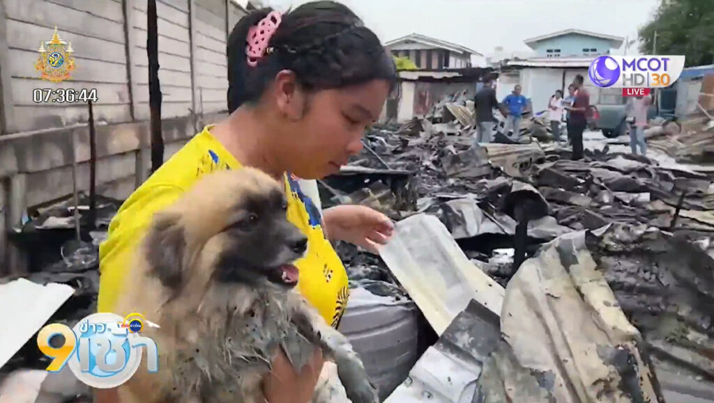 นนทบุรี 27 ก.พ.-ไฟไหม้แคมป์คนงานวอด เจ้าของเศร้าคาดน้องหมา “เจ้าป๊อกเด้ง” ถูกไฟคลอก สุดท้ายวิ่งกระดิกหางออกมาจากร่องน้ำรอดตายหวุดหวิด สภาพหน้าตาดำ ขนไหม้เล็กน้อย