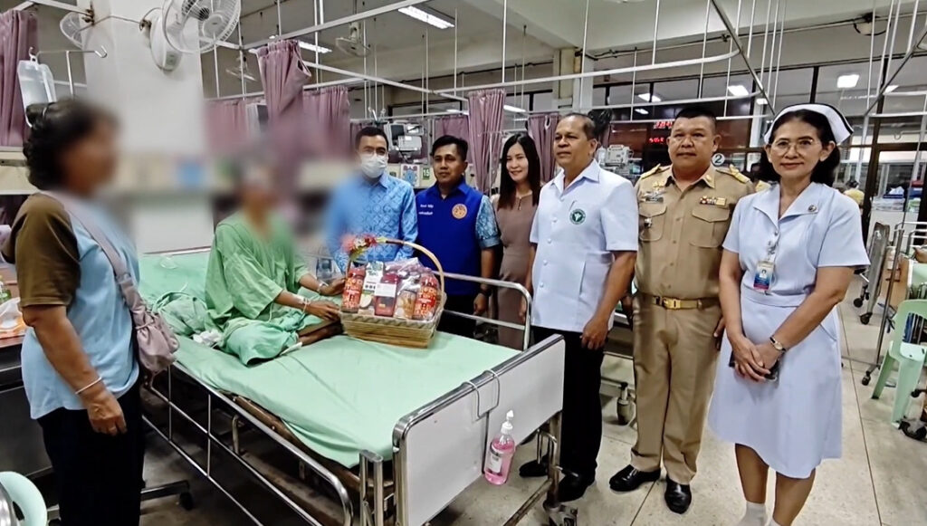 ด้านนายสกุล ดำรงเกียรติกุล รองผู้ว่าฯ ตรัง เป็นตัวแทนผู้ว่าฯ ตรัง เข้าเยี่ยมคนเจ็บที่โรงพยาบาล โดยมีแพทย์ให้ข้อมูลว่า อาการของคนเจ็บน่าจะต้องใช้เวลาในการรักษาไม่ต่ำกว่า 1 เดือน ขณะที่คนเจ็บที่ตอนนี้เริ่มได้สติ บอกว่า ยังรู้สึกมึนๆ ปวดบ่าไหล่ มองเห็นยังไม่ชัด น้ำตาไหลตลอด หมอเย็บ 8 เข็ม พร้อมเล่าย้อนเหตุการณ์ขณะเกิดเหตุให้ฟังด้วย