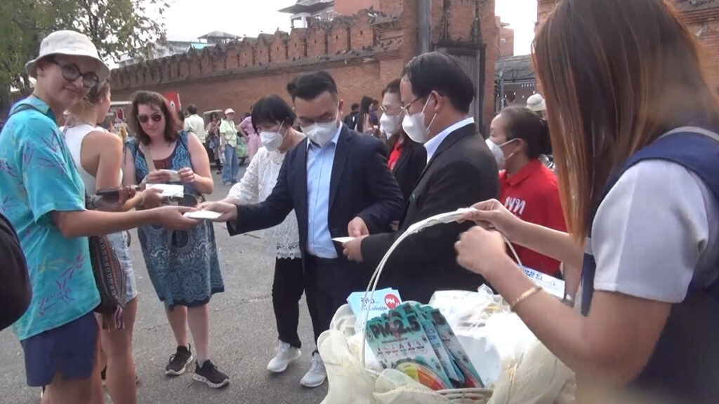 นพ.สราวุฒิ บุญสุข ผู้ตรวจราชการกระทรวงสาธารณสุข นำเจ้าหน้าที่สาธารณสุขและองค์กรท้องถิ่น ออกแจกหน้ากากชนิด N95 และแผ่นพับรณรงค์สร้างความรู้ให้กับประชาชนและนักท่องเที่ยวบริเวณข่วงประตูท่าแพในตัวเมืองเชียงใหม่ เพื่อสู้ฝุ่น PM 2.5 ซึ่งขณะนี้ปกคลุมท้องฟ้าไปทั่วเมือง จนทัศนวิสัยขุ่นมัว มองเห็นกลุ่มหมอกควันไฟป่าที่ลอยในอากาศ ได้อย่างชัดเจนและส่งผลกระทบต่อสุขภาพ