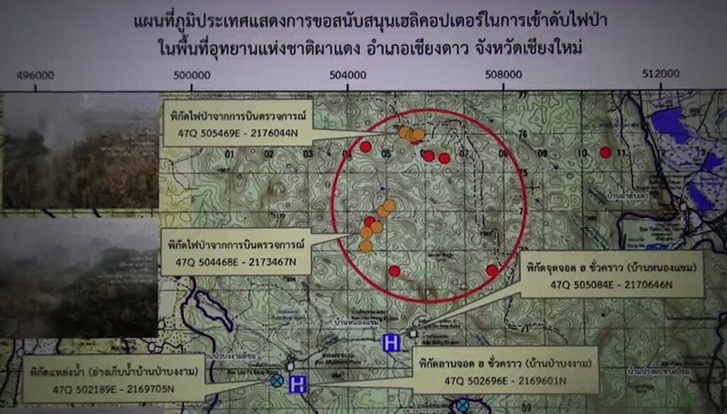 เชียงใหม่ 9 มี.ค.-อำเภอร้องขอเฮลิคอปเตอร์ เข้าสนับสนุนดับไฟป่า บริเวณบ้านหนองแขม ต.เมืองนะ อ.เชียงดาว จ.เชียงใหม่ ที่ไฟป่าลุกไหม้ทั้งคืน จนเกิดกลุ่มควันจำนวนมาก ส่งผลคุณภาพอากาศแย่ ค่า PM2.5 พุ่ง