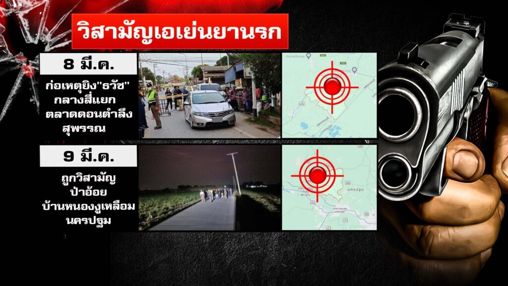 จากกรณี นายธวัช อายุ 47 ปี ถูกยิงเข้าหน้าอกเสียชีวิตอยู่ข้างรถเก๋งฮอนด้า บริเวณสี่แยกตลาดดอนตำลึง ม.4 ต.บ่อสุพรรณ อ.สองพี่น้อง จ.สุพรรณบุรี โดยมีภาพวงจรปิดบันทึกนาทีเกิดเหตุ คนร้ายขับรถกระบะปาดหน้าก่อนลั่นไก หลังเกิดเหตุตำรวจสภ.ทุ่งคอก พร้อมชุด สืบสวน กก.สส.ภ.จว.สุพรรณบุรี แกะรอยติดตามไปตรวจค้นบ้านพักที่ ม.9 ต.บ่อสุพรรณ อ.สองพี่น้อง พยยาบ้า 670 เม็ด ซุกซ่อนอยู่ ส่วนคนร้ายหลบหนีไปได้ ส่วนประเด็นการก่อเหตุ จากการสอบสวน เบื้องต้นพบว่า ผู้ตายและผู้ก่อเหตุ เคยมีปัญหาทะเลาะวิวาทกันมาก่อน คาดว่าน่าจะมาจากเรื่องปมธุรกิจมืด