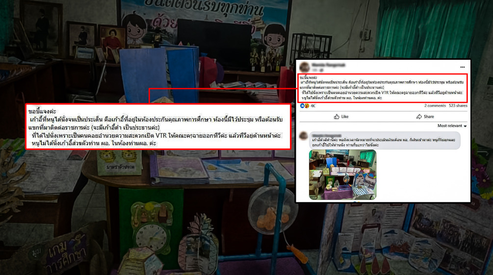 ส่วนชาวบ้านแถวนั้นให้ข้อมูลว่า เห็นการทำงานของ ผอ.ก็เรียกว่ายอมรับได้ แต่ที่ไม่ค่อยเหมือน ผอ.คนอื่นๆ คือ ตั้งแต่ ผอ.คนนี้ย้ายมา ก็มักมีการเรี่ยไรเงิน เรี่ยไรข้าว เพื่อเอาไปใช้ในกิจกรรมบางอย่างของโรงเรียน ซึ่งชาวบ้านแม้ไม่เห็นด้วย แต่ก็ไม่ได้พูดอะไร เพราะลูกหลานก็เรียนอยู่ในโรงเรียน รวมถึงบอกด้วยว่าไม่รู้ว่าเรื่องที่เป็นดราม่าอยู่ในตอนนี้ เป็นเรื่องจริงหรือไม่ แต่พอเห็นแล้วก็ไม่สบายใจ เพราะมันเป็นแค่เรื่องเก้าอี้ เป็นเหตุเล็กๆ ที่ไม่น่าจะต้องจริงจัง หรือบานปลายไปขนาดนี้