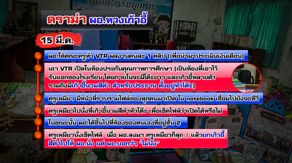 อย่างไรก็ตาม นักข่าวได้พยายามติดต่อไปยัง ผอ.โรงเรียน เพื่อให้ชี้แจงข้อเท็จจริง แต่โทรไปหลายครั้ง ผอ.ก็ไม่รับสาย ส่วนครูเหมียวรับสาย แล้วเล่าว่า เหตุการณ์นี้เกิดขึ้นสดๆ ร้อนๆ เมื่อวานนี้ (15 มี.ค.) โดย ผอ.ให้คณะครูทำ VTR ผลงานมาคนละ 1 คลิป เพื่อนำมาประเมินเงินเดือน แล้ว VTR นี้ก็ให้เอามาเปิดในห้องประกันคุณภาพการศึกษา ซึ่งเป็นห้องที่เอาไว้รับแขกของโรงเรียน โดยภายในจะมีโต๊ะยาว และเก้าอี้หลายตัว รวมถึงมีเก้าอี้นวมสีดำ สำหรับประธาน ตั้งอยู่หัวโต๊ะ