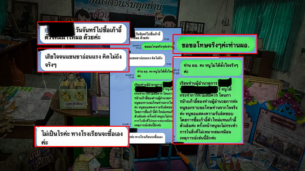 ครูเหมียว ก็ไม่ได้คิดอะไร และฉาย VTR ของทุกคนจนครบ และแยกย้ายกันไป แต่ปรากฏว่า ช่วง 17.00 น. ที่กำลังจะกลับบ้าน ครูเหมียวได้ยิน ผอ.พูดกับครูคนหนึ่งว่า ครูเหมียว มีพฤติกรรมไม่เหมาะสม ที่ไปนั่งที่เก้าอี้ของ ผอ. แต่ตอนนั้นครูเหมียวก็คิดว่า คงไม่มีอะไร ก็กลับบ้าน กระทั่งมาเห็นไลน์ ผอ. เด้งมาในกลุ่มโรงเรียน ตำหนิครูเหมียวที่ไปนั่งเก้าอี้ ผอ. ครูเหมียวเห็นก็พิมพ์ไปขอโทษตามแชทที่ปรากฏในโซเชียล ซึ่งมีจังหวะนึงที่ ผอ. แชท บอกให้ครูอีกคนไปซื้อ หรือไม่ก็ยืมเก้าอี้ตัวใหม่มาให้วันจันทร์ ครูเหมียวเห็นว่าเรื่องราวเกิดขึ้นจากตัวเองเป็นต้นเหตุ และเห็นว่าโรงเรียนก็ไม่มีเงิน จึงเขียนแสดงความรับผิดชอบไปว่าจะออกเงินซื้อเก้าอี้ตัวใหม่มาให้ แต่ ผอ. ตอบว่าไม่เป็นไร และบอกว่าจะซื้อด้วยเงินตนเอง