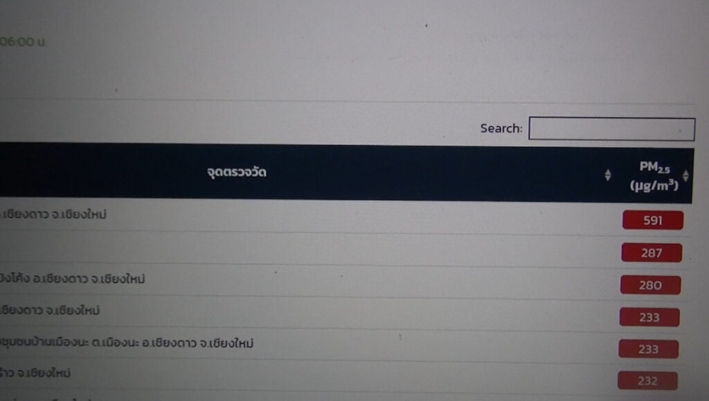 ขณะที่ศูนย์ข้อมูลเปลี่ยนแปลงสภาพภูมิอากาศ มหาวิทยาลัยเชียงใหม่ รายงานคุณภาพอากาศแบบรายชั่วโมง บริเวณบ้านหัวโท อำเภอเชียงดาว เมื่อเวลา 07.00 น. ค่า PM 2.5 สูงถึง 591 ไมโครกรัมต่อลูกบาศก์เมตร หรือสูงเกินค่ามาตรฐานถึง 15 เท่า ซึ่งค่ามาตรฐานกำหนดไว้ไม่เกิน 37.5 ไมโครกรัมต่อลูกบาศก์เมตร ประชาชนในพื้นที่ หายใจติดขัดต้องอยู่แต่ในบ้าน และสวมหน้ากากอนามัย