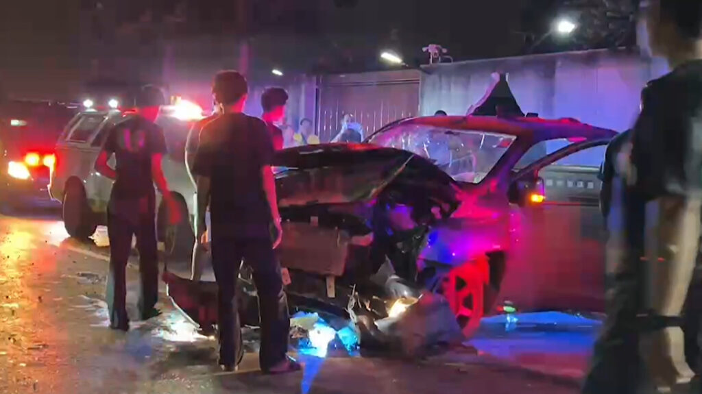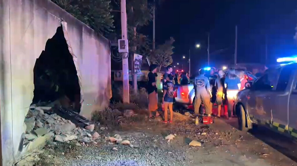 ที่เกิดเหตุพบรถกระบะสภาพหน้ารถพังเสียหายยับเยินจอดขวางถนนอยู่ คนเจ็บเป็นหญิงสาว 4 ราย อยู่ในรถ 3 ราย กระเด็นออกมานอกรถ 1 ราย อาสาสมัครกู้ภัยต้องช่วยกันปฐมพยาบาลเบื้องต้น ก่อนเร่งนำตัวส่ง รพ. ขณะเดียวกันในที่เกิดเหตุยังพบว่ากำแพงคอนกรีตของบ้านประชาชนที่อยู่ริมทางถูกรถกระบะพุ่งชนพังเสียหายจนเป็นรู ซึ่งเหตุการณ์นี้มีวงจรปิดบันทึกเหตุการณ์เอาไว้ได้ ถ้าฟังจากเสียงแล้ว เหมือนรถกระบะคันดังกล่าวเร่งเครื่องและจังหวะเปลี่ยนเกียร์รถก็ไปพุ่งชนกำแพงอย่างแรง