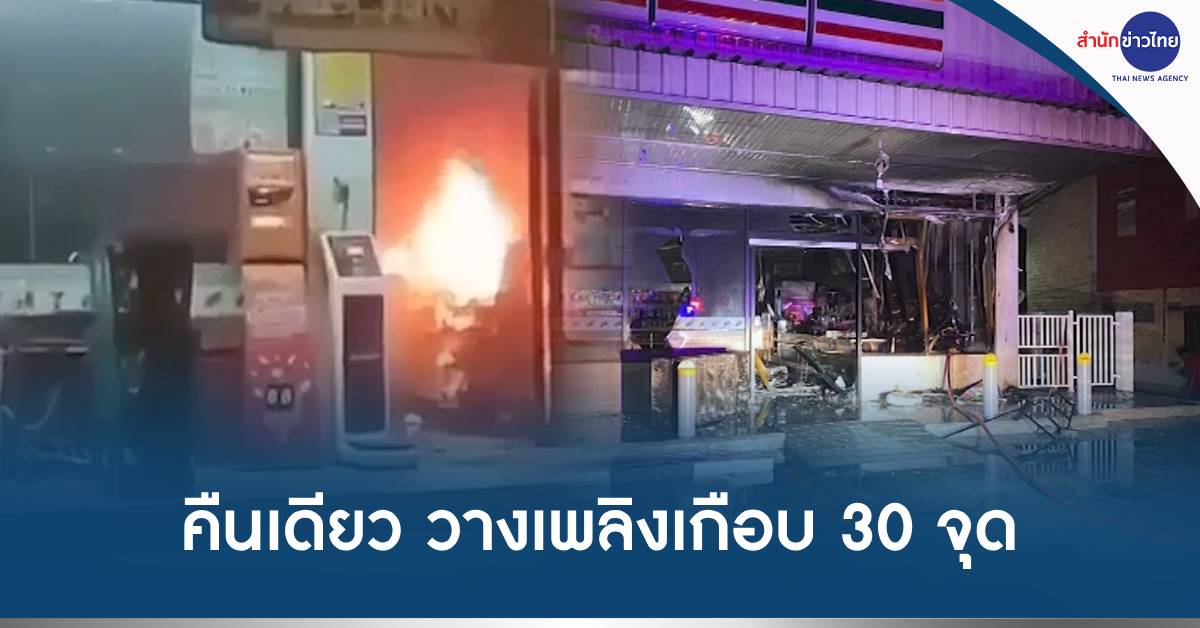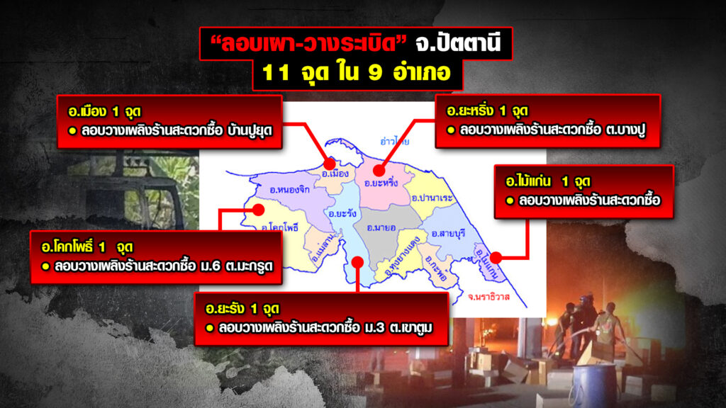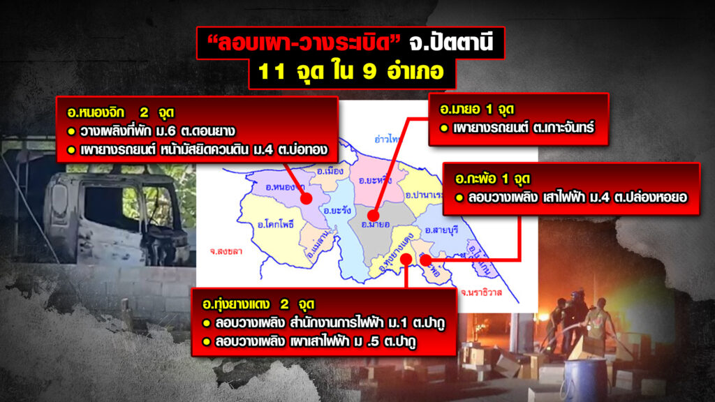 ไปดูที่ จ.ปัตตานี กันก่อน เกิดเหตุ 11 จุด ใน 9 อำเภอ มีทั้งเหตุลอบวางเพลิงร้านสะดวกซื้อ ลอบวางเพลิงเสาไฟฟ้า วางเพลิงสำนักงานการไฟฟ้า เผายางรถยนต์ และลอบวางเพลิงที่พักรีสอร์ท เหตุเกิดในเวลาไล่เลี่ยกัน ช่วงประมาณ ตี 1 กว่าๆ คนร้ายกระจายกำลังเข้าไปก่อเหตุ โดยเฉพาะที่ร้านสะดวกซื้อ ถูกไฟไหม้รุนแรงหลายจุด อย่างที่สาขาปูยุด อ.เมือง ภายในร้านถูกเพลิงเผาเสียหายเกือบ 100 เปอร์เซ็น และยังพบปลอกกระสุนปืนตกอยู่บนถนนหน้าร้าน เป็นกระสุนปืน เอ็ม 16 จำนวน 1 นัด ปลอกกระสุน 9 มม. จำนวน 3 ปลอก เช่นเดียวกับ สาขาโคกโพธิ์ เพลิงเผาไหม้ทำลายทรัพย์สินภายในร้านจนหมด ตรวจสอบเบื้องต้น พบว่า มีคนร้าย 3 คนใช้ผ้าปิดบังใบหน้า บุกเข้าไปในร้านและบังคับให้พนักงานส่งเงินให้กว่า 1 หมื่นบาท จากนั้นคนร้ายได้ไล่พนักงานออกจากร้าน และราดน้ำมันไปทั่วในร้าน ก่อนจุดไฟเผา จากนั้นหลบหนีไป