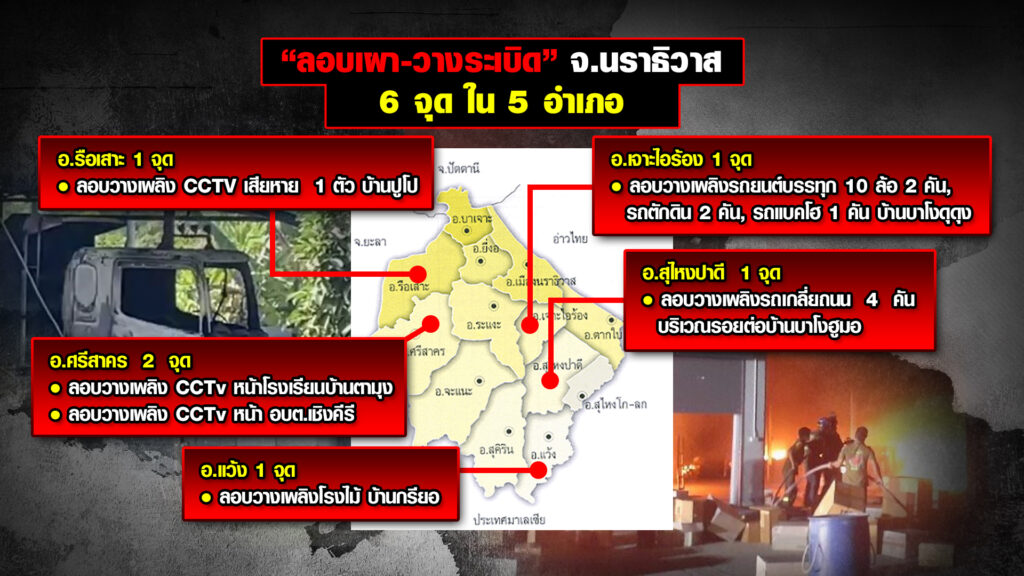 ส่วนที่ จ.นราธิวาส เกิดเหตุใน 5 อำเภอ รวม 6 จุด ซึ่งที่นี่พบว่า คนร้ายพยายามก่อเหตุป่วนการก่อสร้างถนน โดยที่ อ.สุไหงปาดี คนร้ายลอบวางเพลิงรถเกลี่ยถนน เสียหาย 4 คัน และที่ อ.เจาะไอร้อง พบว่า คนร้าย 7-8 คน แต่งกายชุดดำอาวุธปืนครบมือ สวมหมวกไหมพรมปิดบังใบหน้า ลอบวางเพลิงรถบรรทุก 10 ล้อ 2 คัน รถโกยตัก 2 คัน และรถแม็คโคร 1 คัน นอกจากนี้ คนร้ายยังลอบวางเพลิงโรงไม้ กล้อง CCTV และเสาไฟฟ้า