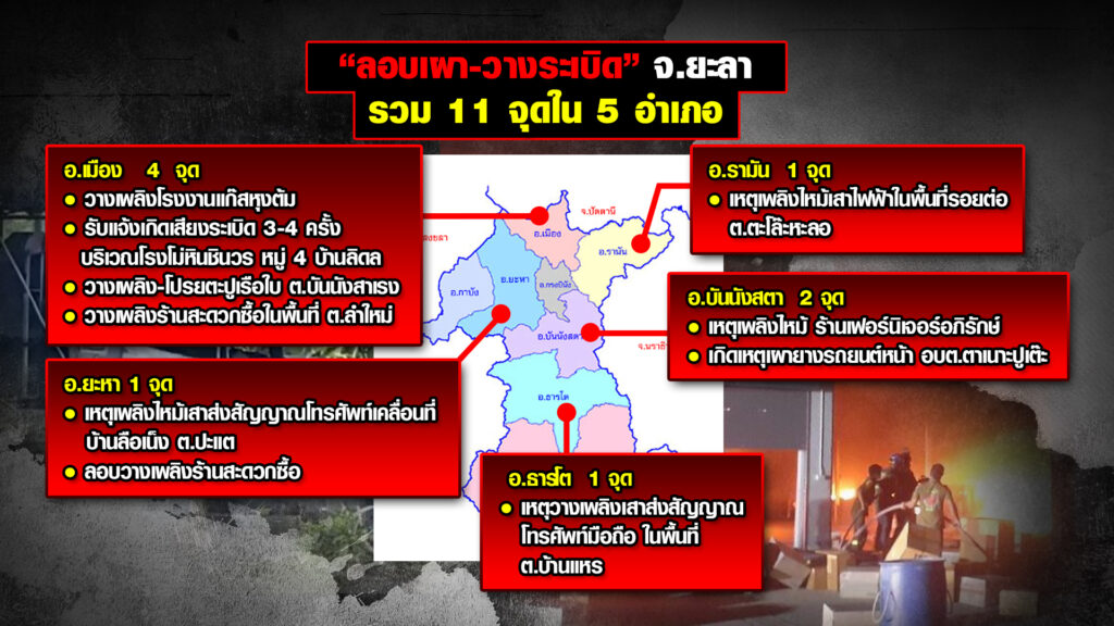 นอกจากนี้ คนร้ายยังวางเพลิงเผาร้านเฟอร์นิเจอร์ เผาเสาไฟฟ้า เผาเสาส่งสัญญาณโทรศัพท์เคลื่อนที่ โปรยตะปูเรือใบและเผายางรถยนต์บนถนนหลายสาย เจ้าหน้าที่ยังได้รับแจ้งว่ามีเสียงระเบิด 3-4 ครั้ง บริเวณโรงโม่หิน ในพื้นที่หมู่ 4 บ้านลิดล อ.เมืองยะลา กำลังเร่งตรวจสอบด้วยความระมัดระวัง