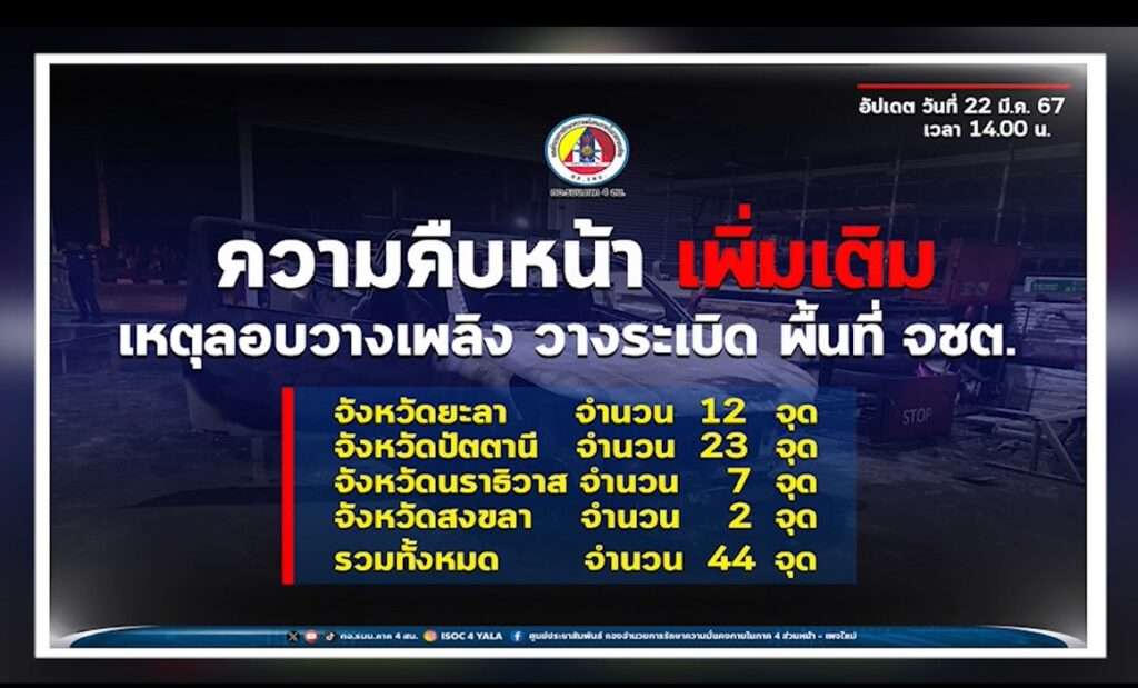 22 มี.ค. – แม่ทัพภาค 4 สั่งขยายผลจับกลุ่มผู้ก่อเหตุป่วนใต้คืนเดียว 44 จุด มีผู้เสียชีวิต 1 ราย เชื่อสร้างสถานการณ์ป่วนเดือนรอมฎอน