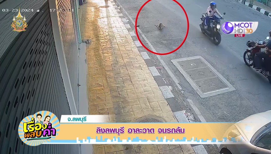 วงจรปิดหน้าร้านค้าแห่งหนึ่ง ในเขตเทศบาลเมืองลพบุรี ตำบลท่าหิน อำเภอเมือง จังหวัดลพบุรี จับภาพขณะชายคนหนึ่งขับรถจักรยานยนต์ผ่าน บนถนนราชดำเนิน หน้าสำนักงานเกษตรและสหกรณ์จังหวัดลพบุรี ก่อนเฉี่ยวชนกับรถจักรยานยนต์อีกคันที่วิ่งสวนมา เนื่องจากโดนลิงกระชากของที่แขวนอยู่ จนรถล้มได้รับบาดเจ็บ เหตุเกิดเมื่อช่วงเย็นของวันที่ 23 มีนาคม ที่ผ่านมา