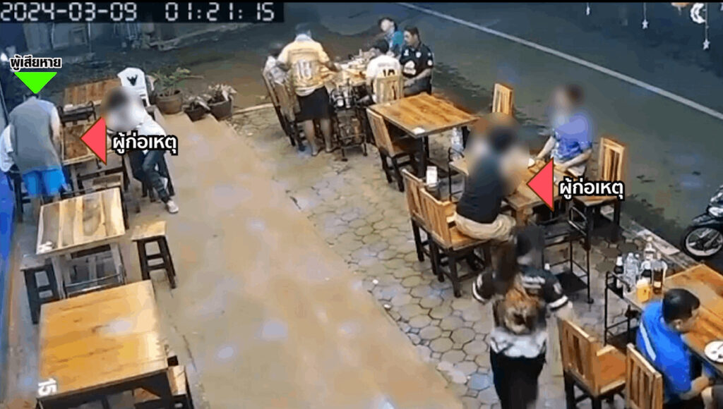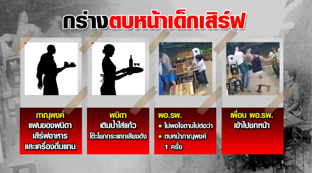 ด้าน นายภานุพงศ์ เล่าต่อว่าหลังจากนั้น เข้าไปทำหน้าที่เสิร์ฟอาหาร เติมเครื่องดื่มแทน แต่จังหวะเดินไปหยิบแก้วของ ผอ.รพ.สต. มาเติมน้ำ โต๊ะโยกแล้วกระแทกเสียงดัง เมื่อเติมน้ำเสร็จ จึงกลับไปรอที่อีกโต๊ะ เพื่อรอบริการ แต่ ผอ.รพ.สต. เดินเข้ามาหาด้วยน้ำเสียงโมโห ก่อนจะตบตนเองไป 1 ที แต่ก็ไม่ได้ตอบโต้ จากนั้นชายอีกคนเดินเข้าหาแล้วชกหน้าทันที จึงต้องตอบโต้ชกหน้าและกระโดดถีบหน้าอกกลับไป 1 ครั้ง จนล้มลง หลังเกิดเหตุ ได้เดินหลบที่หลังร้าน แต่ ผอ.รพ.สต. ยังตามไปหยิบมีดในครัวขู่ทำร้าย และมีเพื่อนหมออีก 2 คน ตามเข้ามาพูดจาข่มขู่สารพัด แอบอ้างคนใหญ่คนโต สุดท้ายเจ้าของร้านปิดประตูครัวและบอกว่าเด็กสู้ไม่ไหวหรอก กระทั่งเหตุการณ์จบลง กลุ่ม ผอ.รพ.สต. แยกย้ายกันกลับบ้าน ล่าสุดแม่นายภานุพงศ์ ผู้เสียหาย ได้รวบรวมหลักฐานยื่นฟ้องศาลจังหวัดตราด เมื่อวันที่ 25 มีนาคม ที่ผ่านมา
