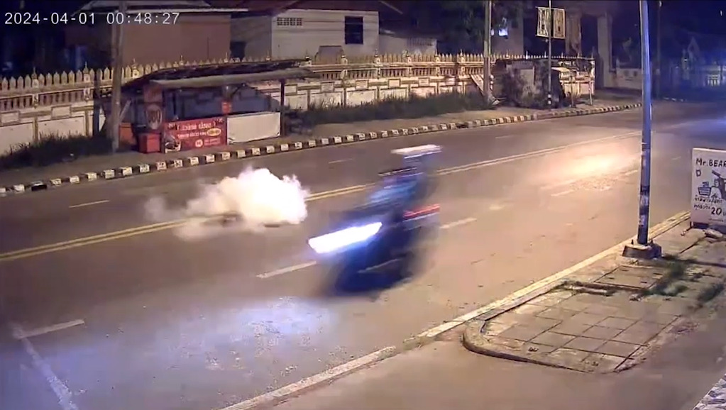 กล้องวงจรปิดบันทึกภาพวัยรุ่นชายขี่จักรยานยนต์ 2 คัน ปาระเบิดใส่พื้นถนนสายอุดรธานี-กุดจับ บ้านเชียงพิณ หมู่ 9 ต.เชียงพิณ อ.เมืองอุดรธานี ช่วงเที่ยงคืนกว่าของวันที่ 1 เมษายน 67