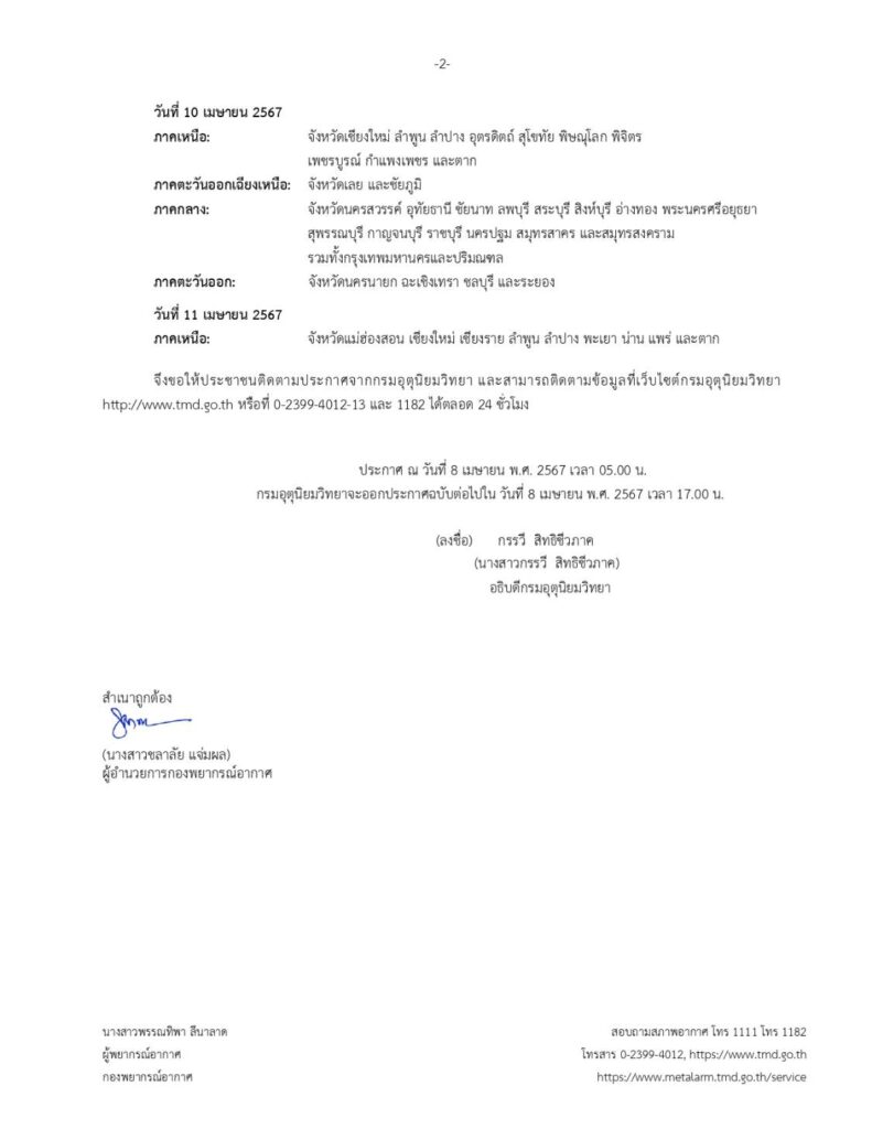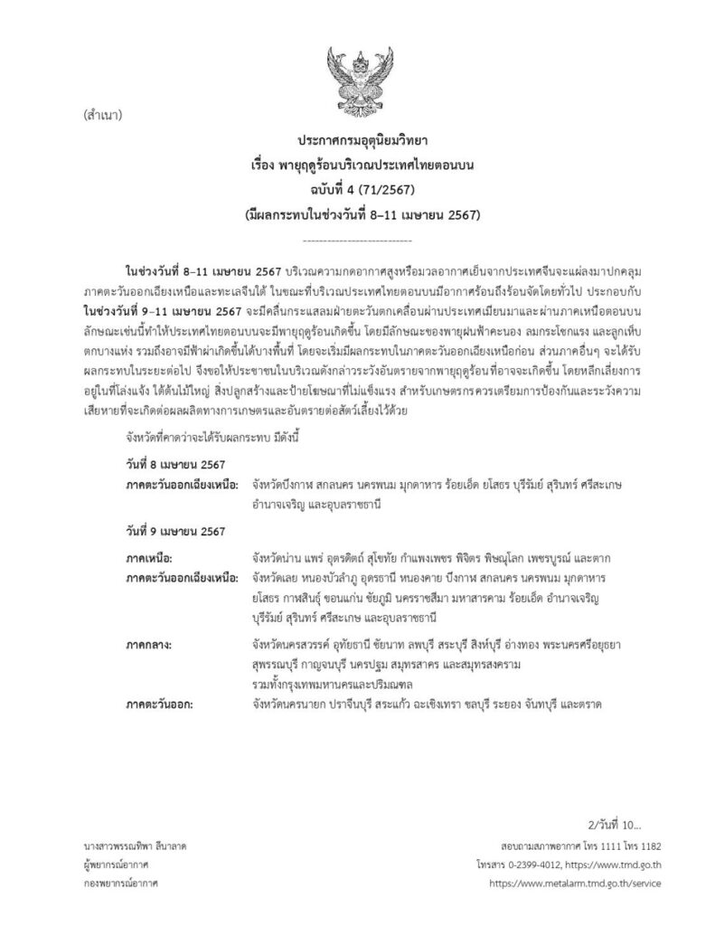 ขณะที่กรมอุตุนิยมวิทยา ประกาศเตือนพายุฤดูร้อนบริเวณประเทศไทยตอนบน ฉบับที่ 4 มีผลกระทบในช่วงวันที่ 8-11 เมษายน 2567 บริเวณความกดอากาศสูงหรือมวลอากาศเย็นจากประเทศจีนจะแผ่ลงมาปกคลุมภาคตะวันออกเฉียงเหนือและทะเลจีนใต้ ในขณะที่บริเวณประเทศไทยตอนบนมีอากาศร้อนถึงร้อนจัดโดยทั่วไป ทำให้ไทยตอนบนจะมีพายุฤดูร้อนเกิดขึ้น โดยมีลักษณะของพายุฝนฟ้าคะนอง ลมกระโชกแรง และลูกเห็บตกบางแห่ง รวมถึงอาจมีฟ้าผ่าเกิดขึ้นได้บางพื้นที่ โดยจะเริ่มมีผลกระทบในภาคตะวันออกเฉียงเหนือก่อน ส่วนภาคอื่นๆ จะได้รับผลกระทบในระยะต่อไป จึงขอให้ประชาชนในบริเวณดังกล่าวระวังอันตรายจากพายุฤดูร้อนที่อาจจะเกิดขึ้น .-สำนักข่าวไทย