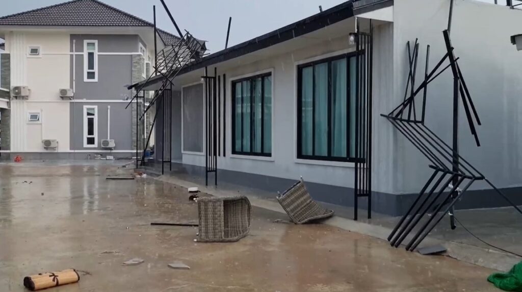 จากภาพจะเห็นความรุนแรงของพายุฤดูร้อนพัดต้นไม้ลู่ลมแทบหัก ตู้กระเด็นล้ม หลังจากนั้นไฟดับ ส่วนภาพนี้คือที่บ้านหรืออาณาจักรของ “โจ ยมนิล” หัวหน้าคณะหมอลำสาวน้อยเพชรบ้านแพง หลังคาโรงซ้อม หลังคาหอพักเปิด ข้าวของกระจัดกระจาย หลังเกิดพายุฤดูร้อนพัดกระหน่ำในพื้นที่ อ.โกสุมพิสัย จ.มหาสารคาม เมื่อเย็นวานนี้ (9 เม.ย.)