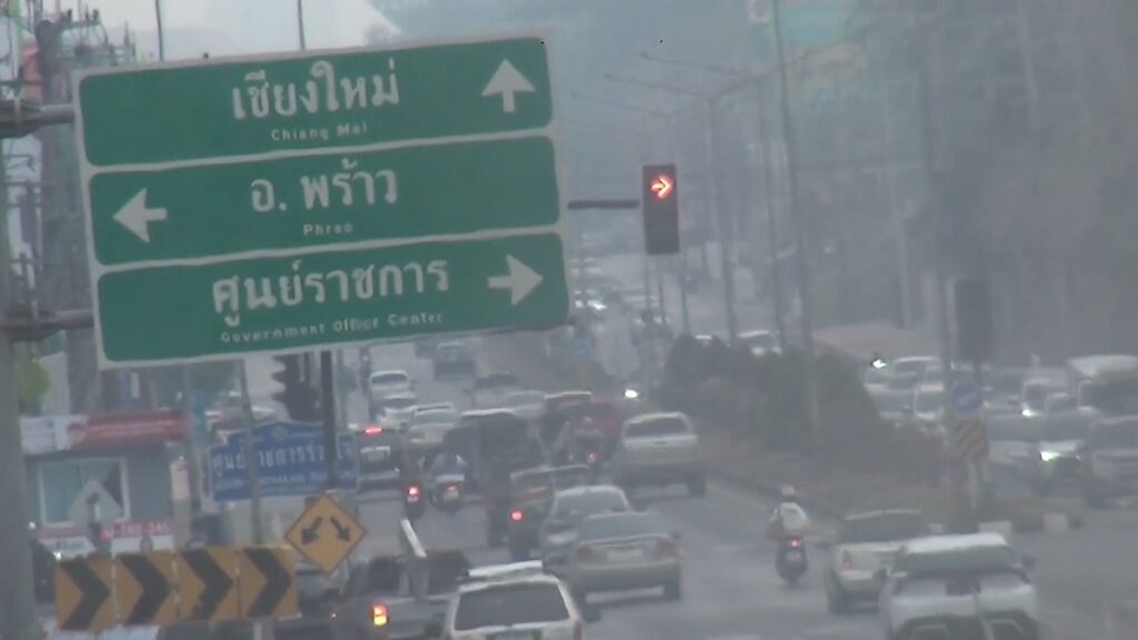 ขณะที่ จ.เชียงใหม่ เช้านี้หมอกควันฝุ่นพิษที่ปกคลุมเบาบางจากทุกวัน มองเห็นดอยสุเทพรางๆ หลังจากมองไม่เห็นมาหลายวัน ค่าฝุ่นพิษลดลงเล็กน้อย หลังจากเมื่อคืนที่ผ่านมามีพายุลมแรง ฝนและลูกเห็บตกบางพื้นที่ เช่น อ.ดอยเต่า ช่วยให้ฝุ่นพิษเบาบางลง แต่เช้านี้หลายพื้นที่ของเชียงใหม่ ค่าฝุ่น PM 2.5 ยังเกินมาตรฐาน โดยค่าฝุ่นรายชั่วโมงจากศูนย์ข้อมูลความเปลี่ยนแปลงสภาพภูมิอากาศ มหาวิทยาลัยเชียงใหม่ สูงสุดเมื่อเวลา 09.00 น. ต.เมืองงาย อ.เชียงดาว 352 ไมโครกรัมต่อลูกบาศก์เมตร ส่วนในเมืองยังเกิน 100 ไมโครกรัมต่อลูกบาศก์เมตร