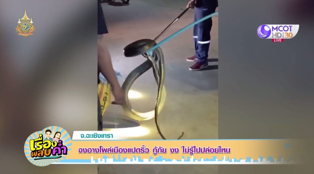 ฉะเชิงเทรา 10 เม.ย. – ชาวบ้านเมืองแปดริ้วผวา เจองูจงอางยาวเกือบ 4 เมตร เข้ามาขดตัวอยู่ในห้องครัว แจ้งเจ้าหน้าที่กู้ภัยมาจับ แต่ไม่รู้จะนำไปปล่อยที่ไหน