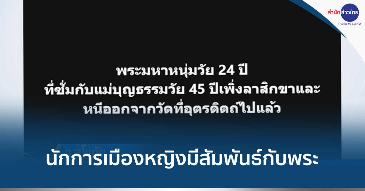 สุโขทัย 11 เม.ย. – นักการเมืองหญิงวัย 45 ปี อดีตผู้สมัคร สส.พรรคการเมืองหนึ่ง ถูกแฉมีสัมพันธ์ชู้สาวกับพระสงฆ์วัย 24 ปี