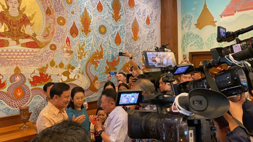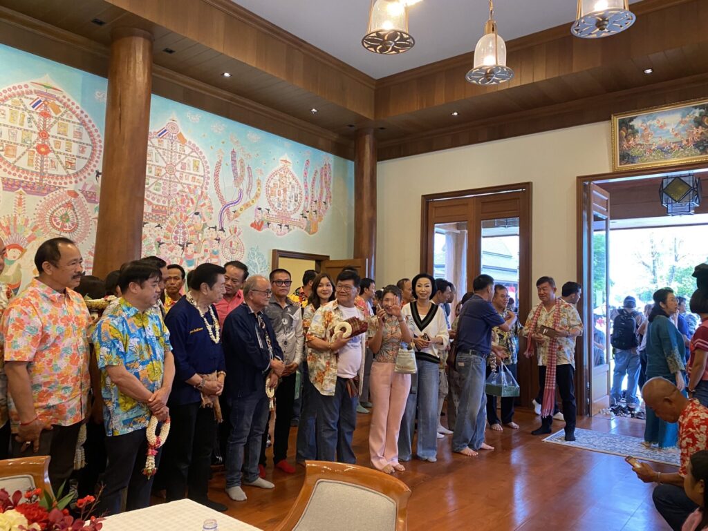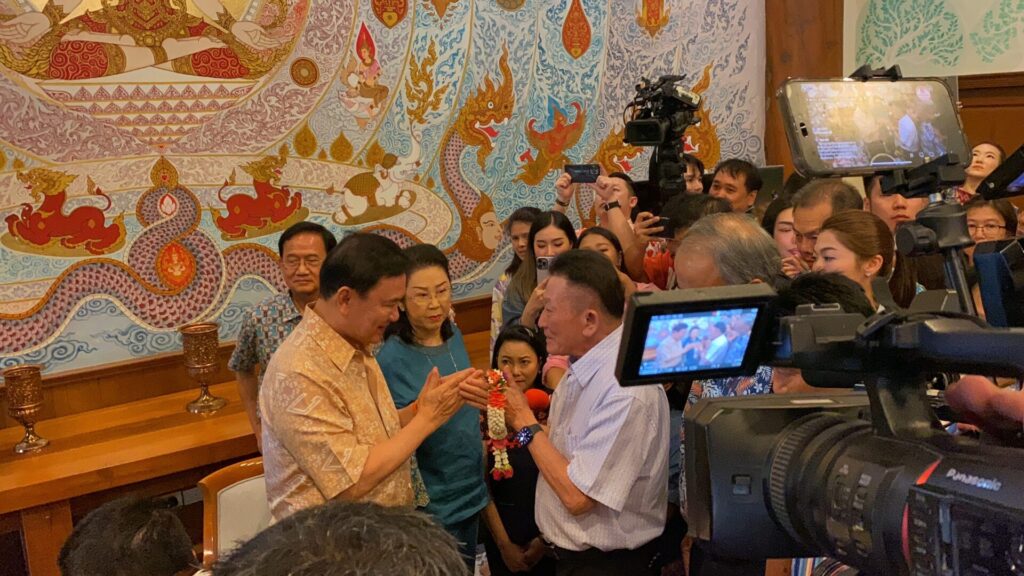 นายทักษิณ กล่าวกับแขกที่มาร่วมงานว่า เป็นยุคดิจิทัล ซึ่งเดี๋ยวเงินดิจิทัลก็มาแล้ว ก็สามารถที่จะรดน้ำดำหัวออนไลน์ได้ แต่วันนี้ได้มีโอกาสมาร่วมงานก็มีความสุขมากวันหนึ่ง ดีใจที่ได้มาร่วมประเพณีรดน้ำดำหัว และเป็นครั้งแรกในรอบ 18 ปี ซึ่งไม่ได้ร่วมงานมานานแล้ว ต้องขอบคุณรัฐมนตรี สส. และนายก อบจ.เชียงใหม่ เพื่อนๆ พี่ๆ น้องๆ ที่มารดน้ำดำหัว ถือว่าได้มาเห็นหน้ากัน เป็นการรดน้ำดำหัวที่ชื่นมื่น ขอบคุณนักการเมืองท้องถิ่นด้วย พร้อมพูดเป็นภาษาเมืองว่า ไม่ได้พูดมานาน เริ่มพูดยาก และไม่ได้มีโอกาสอวยพรใครสักเท่าไหร่ วันนี้มีโอกาสได้อวยพร เพราะอาวุโสที่สุด อายุ 75 แล้ว มีแก่กว่าตนไม่กี่คน