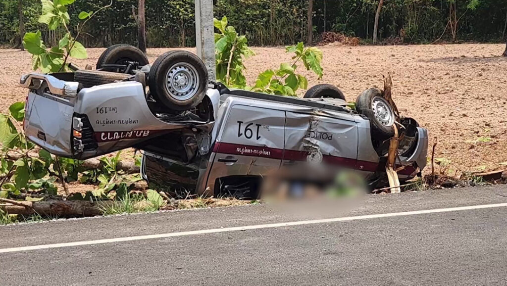 เลย 21 เม.ย. – สลด ผู้ป่วยจิตเวชคลั่งแย่งพวงมาลัย จนรถตำรวจพลิกคว่ำข้างทาง ตำรวจเสียชีวิต 1 นาย บาดเจ็บอีก 3