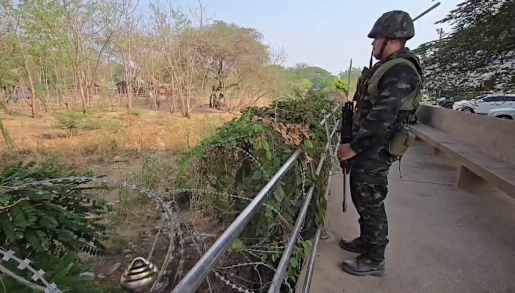 จากเจ้าหน้าที่ทหารหน่วยเฉพาะกิจราชมนู ฝ่ายปกครอง อ.แม่สอด ตำรวจตระเวนชายแดนที่ 346 แม่สอด พร้อมอาวุธครบมือ ยังคงเสริมกำลังและตรึงกำลังเจ้าหน้าที่อย่างแน่นหนา และตรวจลาดตระเวนแนวตะเข็บชายแดนไทย-เมียนมา อย่างเข้มงวดตลอด 24 ชั่วโมง
