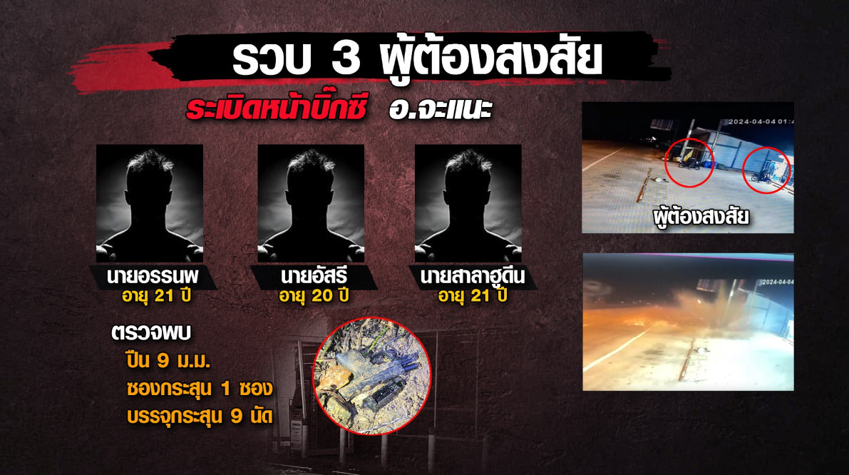 นราธิวาส 23 เม.ย. – ตำรวจรวบ 3 ผู้ต้องสงสัย ลอบวางระเบิดหน้าซูเปอร์มาร์เก็ตดังใน อ.จะแนะ จ.นราธิวาส เมื่อวันที่ 4 เม.ย.ที่ผ่านมา