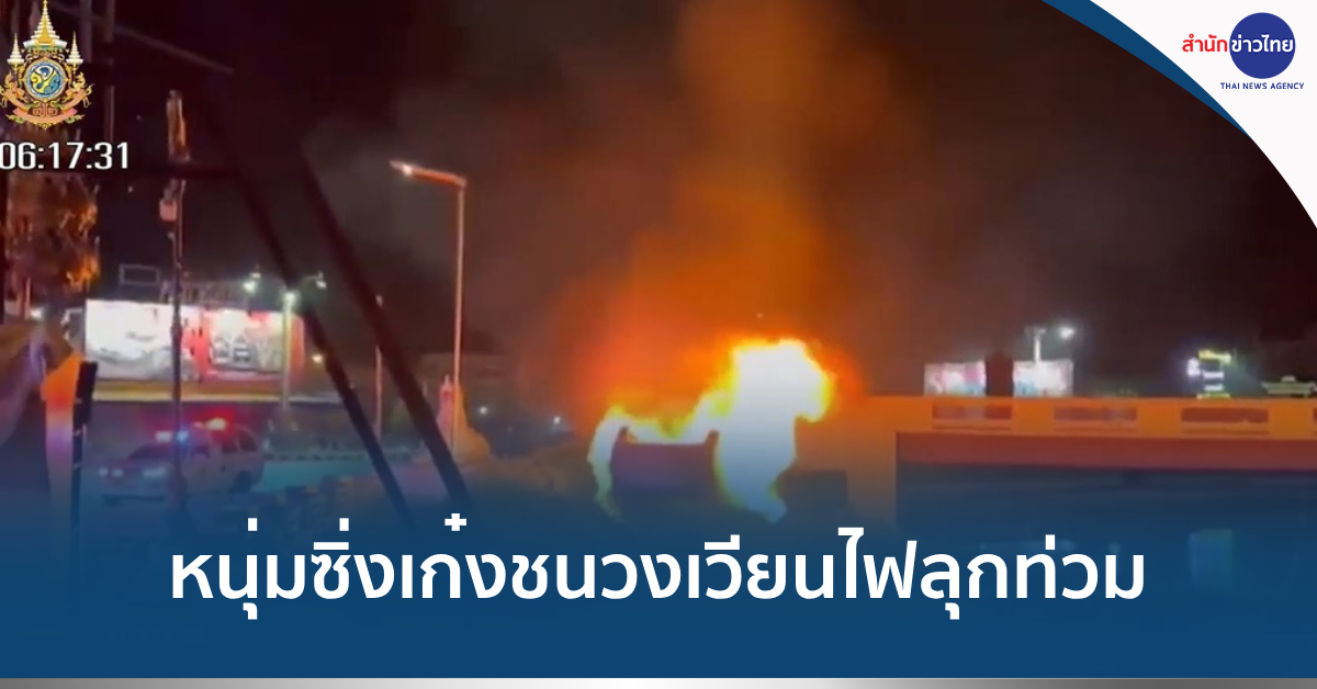 วงจรปิดบันทึกภาพวินาทีรถเก๋งคันหนึ่งขับมาด้วยความเร็ว ก่อนพุ่งชนวงเวียนศรีสุริโยทัย (วงเวียนสระแก้ว) ต.ทะเลชุบศร อ.เมืองลพบุรี ทำให้เกิดเพลิงลุกไหม้ทันที เหตุเกิดเมื่อกลางดึกที่ผ่านมา (23 เม.ย.)