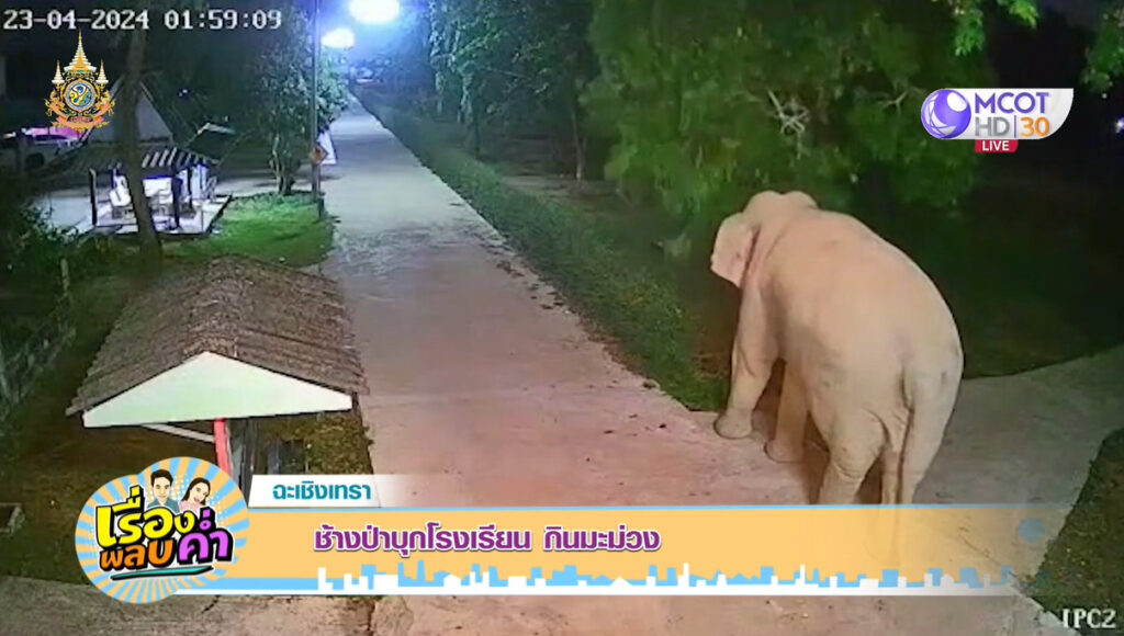 ฉะเชิงเทรา 24 เม.ย.-ช้างป่าบุกเข้าโรงเรียนบ้านวังหิน กินมะม่วงเกือบหมดต้น เหลือไว้ให้ดู 4 ลูก ก่อนเดินออกไปอย่างใจเย็น ทั้ง ผอ. และครู ต่างปล่อยมุข น้องคงมาสมัครเรียน