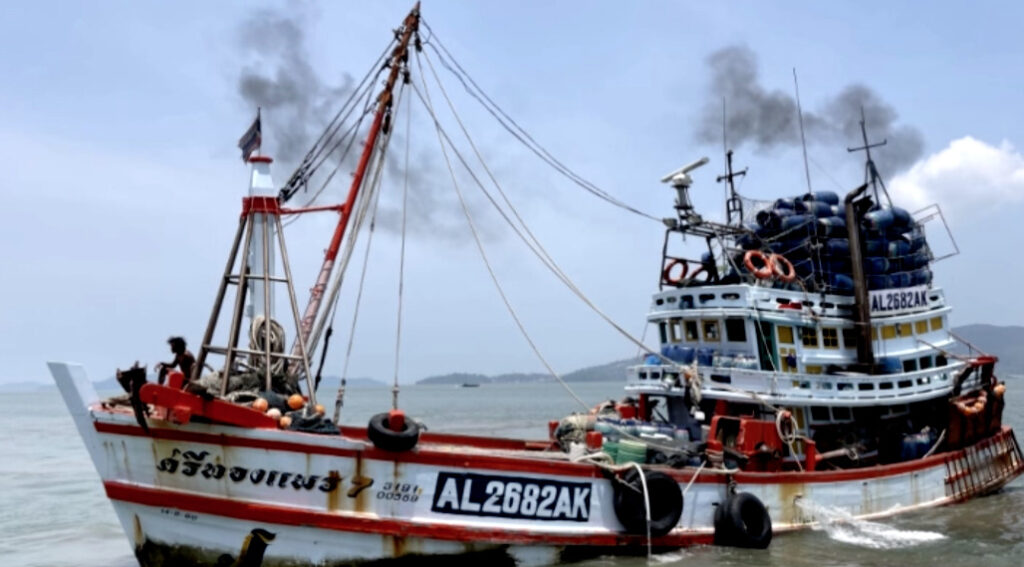 นี่เป็นภาพนาทีเพลิงไหม้เรือประมง “ศรีทองแพร7” เรือเครื่องมือ อวนลากแผ่นตะเฆ่ ขนาดเรือ 67.48 ตันกรอส มีลูกเรือ 9 คน ชาวไทย 2 คนและชาวเมียนมา 7 คน ขณะรับน้ำมันกลางทะเลและได้อับปางลง โดยช่วงเวลา 03.30 น. ศูนย์ควบคุมความมั่นคงท่าเรือจังหวัดพังงา ได้รับแจ้ง เกิดเหตุเพลิงไหม้เรือ ห่างจากฝั่ง 15 ไมล์ ทางทิศตะวันตกเฉียงใต้ของหมู่เกาะสุรินทร์ ต.เกาะพระทอง อ.คุระบุรี จ.พังงา