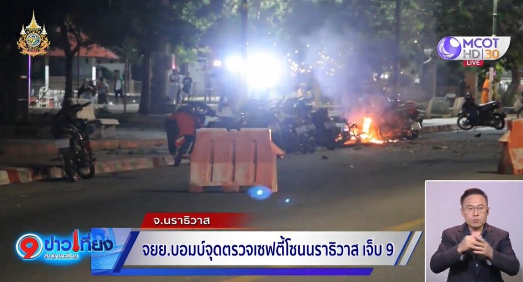 นราธิวาส 7 พ.ค. – เหตุจักรยานยนต์บอมบ์จุดตรวจเซฟตี้โซนท่าพระยาสาย กลางเมืองนราธิวาส ทำให้มีผู้บาดเจ็บ 9 คน พบรถจักรยานยนต์ที่คนร้ายนำมาใช้ก่อเหตุเป็นรถที่จี้มาจาก อ.ตากใบ