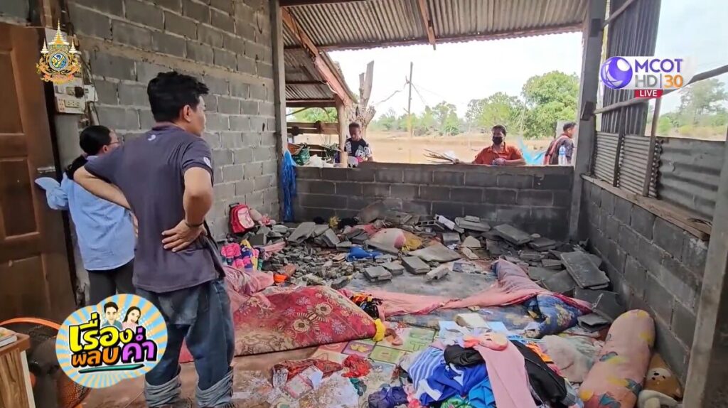 ที่เกิดเหตุเป็นบ้านพักอาศัยชั้นเดียว กำแพงก่อด้วยอิฐบล็อกยังไม่ได้ฉาบ อยู่กลางทุ่งนา นายสีบู่ อายุ 59 ปี เล่าว่า คนตายและคนเจ็บเป็นหลานสาวของตน คนตายอายุ 8 ขวบ คนเจ็บอายุ 10 ขวบ ช่วงที่เกิดเหตุอยู่ด้วยกันทั้งหมด 5 คน มีตนเอง ภรรยา หลานชายอยู่ด้านนอก ส่วนหลานสาว 2 คน หลบฝนอยู่ในบ้าน ระหว่างนั้นมีลมพายุ (ลมหมุน) พัดพุ่งใส่กำแพงบ้านจนกำแพงล้มทับหลานทั้ง 2 คน คนพี่ได้รับบาดเจ็บ ส่วนน้องสาวบาดเจ็บสาหัส ตนจึงได้เรียกภรรยา และหลานชายเข้ามาช่วยเอาอิฐออกจากร่างของหลานทั้งสองคน