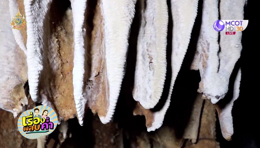 พอพ้นทางเข้าที่ยากลำบาก ก็จะพบกับห้องโถงค่อนข้างใหญ่ เมื่อใช้ไฟฉายส่องไปตามผนังถ้ำ เห็นหินงอกหินย้อยเป็นรูปทรงคลายหยดเทียนเต็มผนัง ส่องประกายงดงามแปลกตา บางจุดเป็นแท่งคลายรังผึ้ง เมื่อนำไฟส่องใกล้ๆ จะสะท้อนระยิบระยับคล้ายกากเพชร ด้านในยังแบ่งเป็นห้องๆ มีหินงอกหินย้อยลักษณะเป็นดอกขาวโพลนคล้ายปุยนุ่น เป็นเกล็ดหิมะ บางจุดกำลังงอกเป็นแท่งเล็กๆ