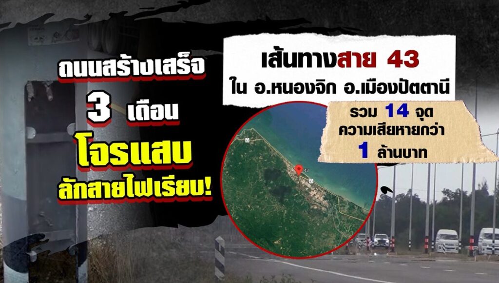 ผู้อำนวยการแขวงทางหลวงปัตตานี และเจ้าหน้าที่แขวงทางหลวงปัตตานี พร้อมด้วยสื่อมวลชน ได้ลงพื้นที่เส้นทางสายใหม่ปัตตานี สาย 43 ที่เพิ่งสร้างเสร็จเพียง 3 เดือน หลังพบว่าโดนมือดีขโมยสายไฟฟ้าส่องสว่างริมทางตลอดทั้งเส้นทาง ใน อ.หนองจิก และ อ.เมือง รวม 14 จุด ได้รับความเสียหายอย่างหนัก ส่งผลให้ประชาชนร้องเรียนเข้ามาเป็นจำนวนมาก ว่าถนนเส้นใหม่ดังกล่าวมืดและมองไม่เห็นเส้นทาง เสี่ยงต่อการเกิดอุบัติเหตุ เบื้องต้นความเสียหายมากกว่า 1 ล้านบาท