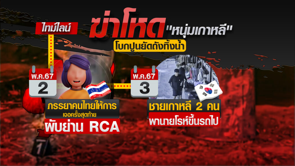 เมื่อวานนี้ (11 พ.ค.67) ช่วงเวลา 18.00 น. นักประดาน้ำมูลนิธิสว่างบริบูรณ์ธรรมสถานเมืองพัทยา ช่วยกันค้นหาถังน้ำพลาสติกสีดำขนาด 200 ลิตร ที่คาดว่าจะนำชาวเกาหลีใส่ถังแล้วทิ้งลงน้ำ หลังจากที่ พล.ต.ต.ธีรเดช ธรรมสุธีร์ ผู้บังคับการสืบสวนสอบสวน กองบัญชาการตำรวจนครบาล ประสานไปยัง พ.ต.อ.ทวี กุดแถลง ผกก.สภ.หนองปรือ หลังญาติมาแจ้งว่าผู้ตายหายไปตั้งแต่สัปดาห์ก่อน โดยทางสืบนครบาลจึงมีการติดตามออกหาข่าวจนพบศพดังกล่าว บริเวณบ่อน้ำ อ่างเก็บน้ำมาบประชัน หมู่ 3 ต.หนองปรือ อ.บางละมุง จ.ชลบุรี โดยนักประดาน้ำใช้เวลาดำค้นหาประมาณ 1 ชั่วโมง จึงพบถังน้ำดังกล่าว อยู่ที่ก้นอ่างความลึกประมาณ 3 เมตร ห่างจากขอบฝั่ง 2 เมตร จากนั้นนักน้ำประจึงใช้เชือกดึงขึ้นมาด้วยความยากลำบาก โดยใช้เวลาประมาณ 30 นาที จึงสามารถนำขึ้นฝั่งได้สำเร็จ เมื่อตรวจสอบภายในถัง พบปูนโบกอยู่เต็ม เจ้าหน้าที่ต้องใช้มีดเปิดก้นถังพลาสติก จึงพบศพชายชาวเกาหลี อายุ 30-35 ปี สูงประมาณ 170 ซม. ถูกฆ่าโบกปูนอยู่ด้านใน