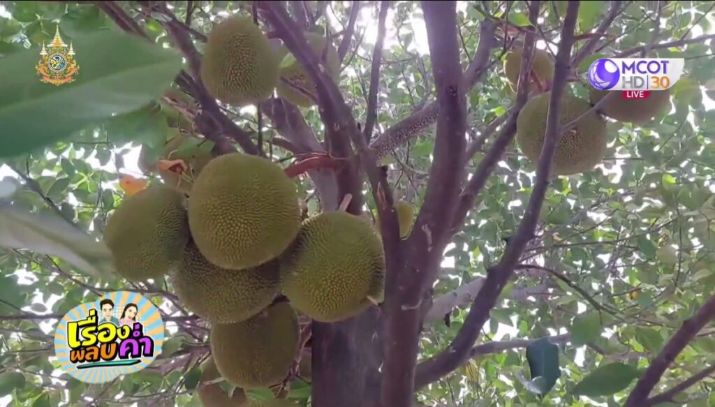 ขนุนพันธุ์พื้นเมือง ที่ลุงแดงปลูกไว้ในสวน ที่ ต.ป่าตัน เมืองเชียงใหม่ สูงประมาณ 5-6 เมตร หากดูเผินๆ นึกว่ามีแต่ใบ พอเดินเข้าไปดูใกล้ ๆ จะเห็นลูกขนุนเต็มต้น ทั้งตามลำต้น ตามกิ่ง บางกิ่ง มีนับสิบลูก ทั้งลูกเล็ก ลูกใหญ่ นับรวมๆ ดูแล้วเกือบ 100 ลูก บางลูก หนักเกือบ 10 กิโลกรัม