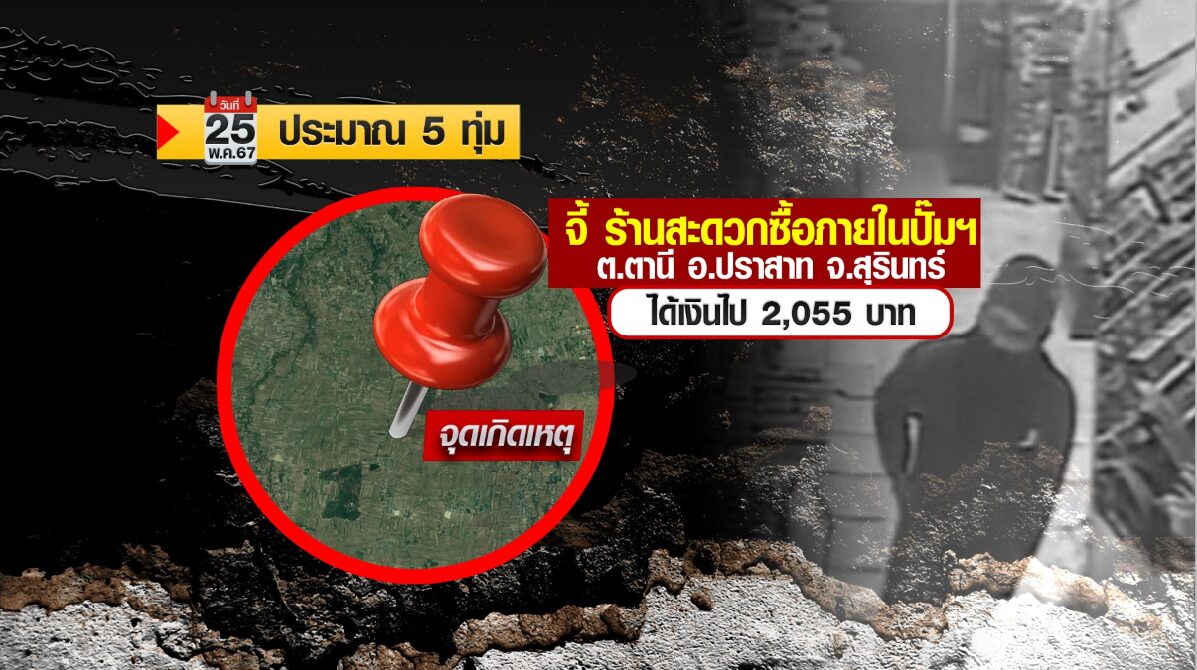 ตำรวจ สภ.โชคนาสาม อ.ปราสาท จ.สุรินทร์ ได้รับแจ้งเหตุคนร้ายชักมีดปลายแหลมออกมาข่มขู่ชิงเงินสดพร้อมกล่องเหล็กตู้เติมเงินของร้านสะดวกซื้อภายในปั๊มน้ำมัน ต.ตานี อ.ปราสาท จ.สุรินทร์ ก่อนหลบหนี ได้เงินไป 2,055 บาท