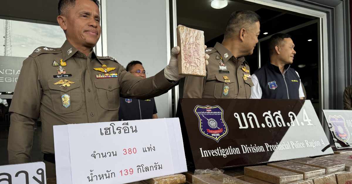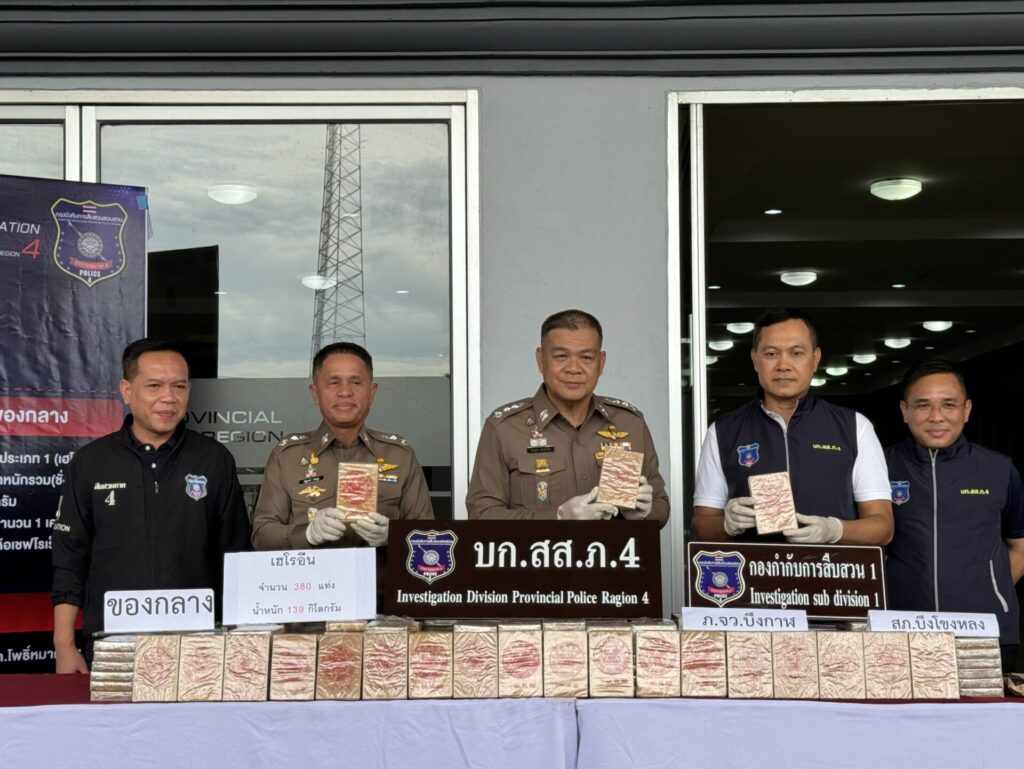 พล.ต.ท.สรายุทธ สงวนโภคัย ผบช.ก.4 เปิดเผยว่า จากการสืบสวนขยายผลเครือข่ายกลุ่มผู้กระทำความผิดจากการข่าวทราบว่าจะมีการลักลอบขนยาเสพติดขนาดใหญ่จากประเทศเพื่อนบ้านเข้าสู่พื้นที่ชั้นในของประเทศ จึงได้นำกำลังลงพื้นที่ชายแดน จ.บึงกาฬ และ จ.นครพนม จนกระทั่งวันที่ 25 พ.ค. ชุดจับกุมได้ตรวจพบรถต้องสงสัยในการขนยาเสพติดขับรถอยู่บริเวณ อ.บึงโขงหลง จ.บึงกาฬ จึงได้ทำการตรวจสอบและสกัดจับกุม โดยทราบชื่อผู้ต้องหาเพศชาย อายุ 29 ปี เป็นคน จ.เพชรบูรณ์ และพบกระสอบห่อด้วยถุงพลาสติกสีดำ จำนวน 3 กระสอบ ตรวจพบเป็นสารเสพติดประเภทเฮโรอีนจึงควบคุมตัวของกลางไปสอบสวนขยายผลที่ สภ.บึงโขงหลง จากการตรวจสอบพบเป็นเฮโรอีน 380 แท่ง น้ำหนักรวม 139 กิโลกรัม ผู้ต้องหาให้การรับสารภาพและเพิ่งพ้นโทษจำคุกในข้อหาเกี่ยวกับยาเสพติดมาเมื่อช่วงต้นปี และได้รับการว่าจ้างจากนายทุนให้ขนยาเสพติดจำนวนดังกล่าวไปส่งที่ จ.เพชรบูรณ์ ได้ค่าจ้าง 100,000 บาท