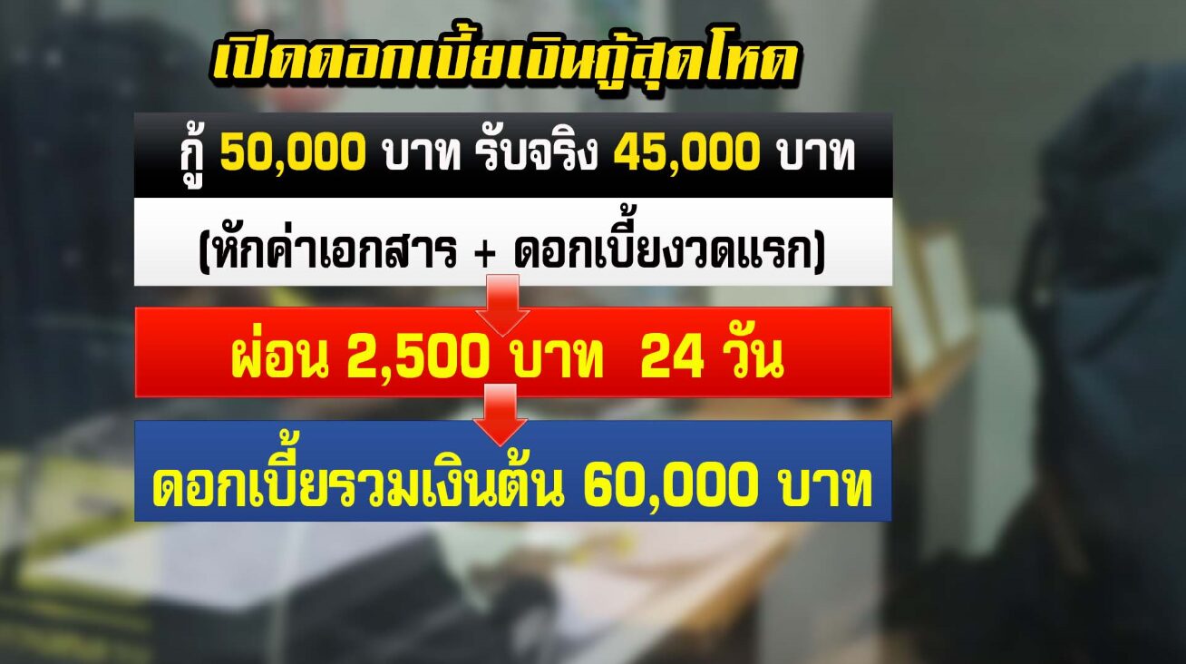 กระทั่งได้มาเจอกับนามบัตรของนายทุนเงินกู้ ที่ชื่อนัท ระบุข้อความว่า บริการเงินทุน ยินดีให้คำปรึกษา สำหรับทุกอาชีพ อนุมัติรวดเร็ว ทันใจ วงเงินตั้งแต่ 2,000-100,000 บาท จึงได้ติดต่อไปครั้งแรก กู้เงินมา 40,000 บาท แม้รู้ว่าดอกโหดแต่ก็จำเป็นเพื่อนำไปจ่ายให้กับเจ้าหนี้รายอื่น จนเมื่อไม่นานนี้ รร. เปิดเทอม ลูกสองคนจะต้องใช้จ่าย จึงขอกู้เพิ่มเติม ซึ่งเงินเก่าก็ผ่อนไปได้เกือบครึ่งทางแล้ว ครั้งนี้ได้กู้ในวงเงิน 50,000 บาท เพราะจะนำไปซื้ออุปกรณ์เรียนและชุดเสื้อผ้า แต่ด้วยเศรษฐกิจไม่ดี งานที่ทำเงินเกิดติดขัดอีก จึงได้ขอผ่อนผันกับเจ้าหนี้ โดยเสนอว่า จะขอรวบรวมและผ่อนจ่ายเป็นรายเดือน เนื่องจากผ่อนวันละ 4,500 บาท ไม่ไหวจริงๆ แต่เจ้าหนี้กลับข่มขู่ ตนเองจึงมาขอความช่วยเหลือกับเจ้าหน้าที่ตำรวจ