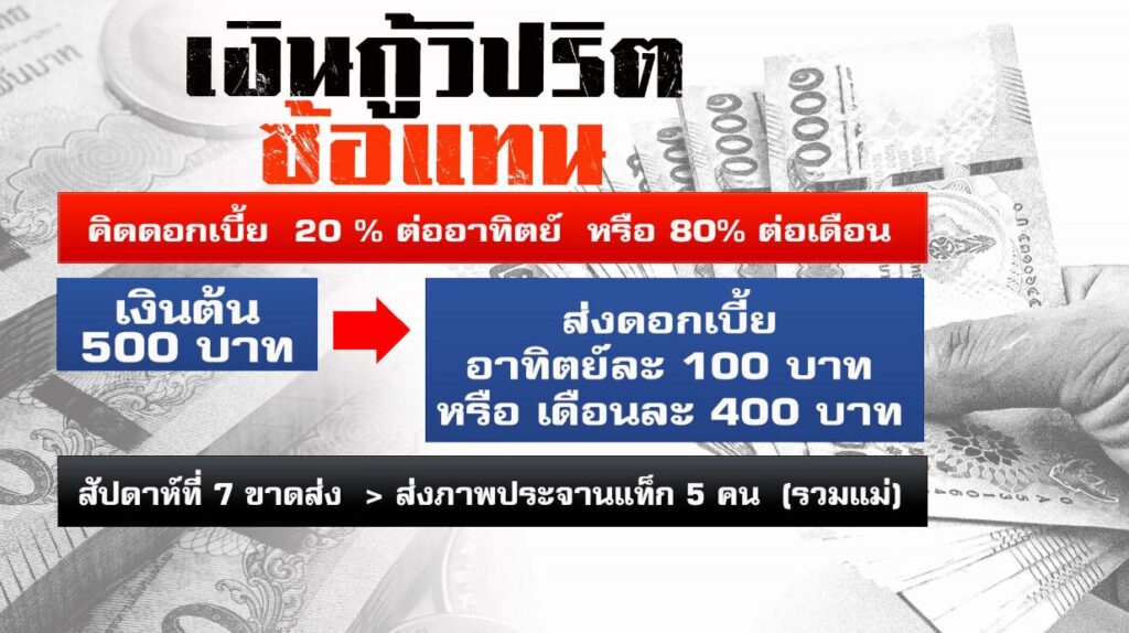 หลังเขียนสัญญาและถ่ายรูปส่ง ไม่เกิน 15 นาที เงินจำนวน 500 บาท ก็โอนเข้ามาในบัญชีของตน โดยซ้อแทน คิดดอกร้อยละ 20 ต่ออาทิตย์ หรือร้อยละ 80 ต่อเดือน คือแต่ละอาทิตย์ ต้นเองต้องส่งดอก 100 บาท เท่ากับส่งดอกเดือนละ 400 บาท จากเงินต้นแค่ 500 บาท ตนเองก็ส่งดอกมาโดยตลอด ทั้งหมด 6 สัปดาห์ พอเข้าสัปดาห์ที่ 7 เงินเดือนของตนเองยังไม่ออก จึงติดต่อขอนัดส่งดอกรุ่งขึ้นอีกวัน แต่เมื่อตนเองผิดนัด ซ้อแทนก็โพสต์รูปของตนที่เปลือยเปล่า และแท็กหา บุคคลค้ำประกัน จำนวน 5 คน ที่ตนเองใส่รายละเอียดไว้ก่อนหน้านี้ในสัญญากู้ และหนึ่งในนั้นคือเฟซแม่ของตน ตนเองมาทราบเรื่องก็ตอนที่แม่มาถามว่าทำไมรูปเปลือยของตนเองอยู่ในโซเชียล ตอนนี้รู้สึกกังวลใจเป็นอย่างมาก ทั้งข้อมูล บัตรประจำตัวประชาชน ข้อมูลส่วนตัว ถูกโพสต์ประจานอยู่ในโลกออนไลน์