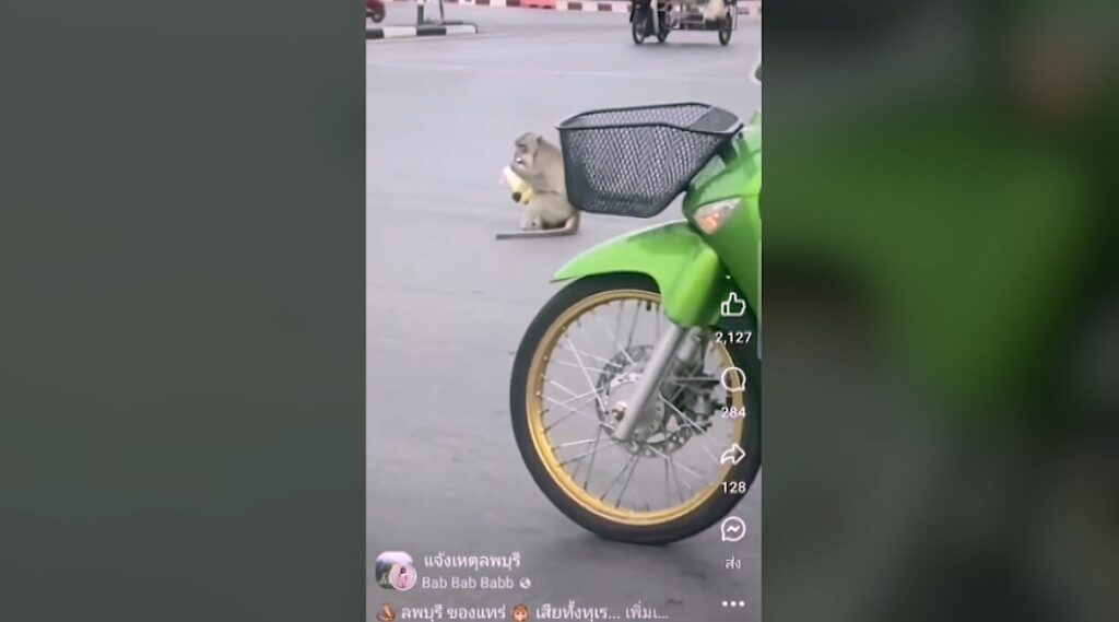 คลิปภาพ ชาวบ้านกำลังยกจักรยานยนต์สีเขียวที่ล้มลง หลังถูกลิงบุกมาทำร้ายและแย่งทุเรียนไป เหตุเกิดบริเวณสามแยกถนนวิชาเยนทร์ ก่อนถึงศาลพระกาฬ จ.ลพบุรี