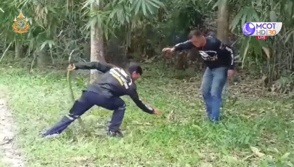 หลังจากที่ลงพื้นที่ไปยังจุดที่จงอางตัวนี้ทำรังวางไข่อยู่ก็พบงูจงอางขนาดใหญ่ซ่อนตัวอยู่ในกอไผ่โผล่แต่หัวออกมา และพบว่ามันกำลังกลืนกินงูสิงเข้าไปเกือบหมดตัวเหลือเฉพาะหาง เจ้าหน้าที่จึงปล่อยให้มันกินให้เสร็จ แล้วรอให้มันเลื้อยกลับเข้าไปที่รัง เพื่อหาที่ตั้งของรัง และเมื่อรู้ว่ามันทำรังอยู่ใต้กอไผ่ ทีมจับก็เข้าไปล้อมบริเวณกอไผ่ เพื่อวางแผนจับ ซึ่งไม่ง่าย พองูจงอางเห็นคน มันก็ชูคอขู่พร้อมสู้ทันทีเพราะว่าในรังมีไข่ มันหวงไข่มาก ซึ่งหากการจับงู ไม่ระมัดระวัง ไม่ชำนาญ เจ้าหน้าที่จะเกิดอันตรายได้ เจ้าหน้าที่ต้องช่วยกันหลอกล่อให้มันออกมา ซึ่งใช้เวลากว่า 10 นาที ก็สามารถจับตัวมันเอาไว้ได้ โดยเจ้าหน้าที่ใช้เพียงมือเปล่าล๊อคคอ ก่อนจะนำตัวมันใส่ลงไปในกระสอบ และทำการรื้อรังไข่ของงูจงอาง เพื่อเอาไข่ออกมาซึ่งมีถึง 35 ฟอง สำหรับงูจงอาง จนท.จะนำไปปล่อยคืนสู่ป่าธรรมชาติที่ห่างไกลชาวบ้าน ส่วนไข่จะนำไปฟักและปล่อยสู่ป่าเช่นกัน.-สำนักข่าวไทย