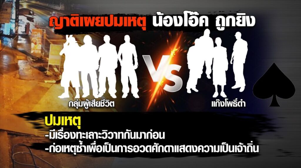 ล่าสุดทางญาติผู้เสียชีวิต ออกมาเปิดเผยว่า ก่อนหน้านี้ประมาณ 2 สัปดาห์ กลุ่มผู้ตายได้มีเรื่องทะเลาะวิวาทกับ กลุ่มวัยรุ่นระหว่างหมู่บ้านอยู่ในพื้นที่อำเภอเดียวกัน ที่สร้างปัญหาทะเลาะวิวาทเป็นประจำมีชื่อว่า “แก๊งโพธิ์ดำ” จึงมั่นใจว่าจะมีการก่อเหตุซ้ำ เพื่อเป็นการอวดศักดาแสดงความเป็นเจ้าถิ่น นอกจากนี้จากการตรวจสอบประวัติยังพบว่าแก๊งโพธิ์ดำ เคยก่อเหตุยิง ปืนกลใส่คู่อริในงานบุญประเพณี ทำให้หญิงสาวเยาวชน เสียชีวิต โดยสามารถจับกุมผู้ก่อเหตุได้ 3 ราย เป็นสมาชิกแก๊งโพธิ์ดำ แต่เชื่อว่ายังมีทีมงานที่ยังคึกคะนองอวดศักดา แสดงความเป็นเจ้าถิ่นมาก่อเหตุซ้ำอีก