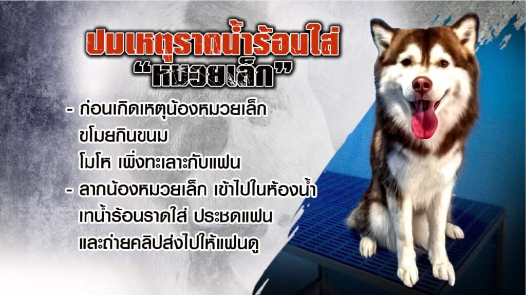 ล่าสุดสุนัข “ไซบีเรียนฮัสกี้” เพศเมีย ที่รักษาตัวจากอาการถูกน้ำร้อนราดตัวแผ่นหลังจนเนื้อสุกเป็นแผลพุพอง จนหายดี เพียงเพราะไปกินขนมของผู้เลี้ยงคนเดิมจนหมด ทำให้เจ้าของเดิมโกธรจัด ผูกเชือกสายจูงที่คอไว้กับช่องใส่กระดาษชำระในห้องน้ำ ต้มน้ำร้อนราดเจ้าเล็ก จนน้ำร้อนหมดกา และถ่ายคลิปวีดีโอไว้ด้วย โดยที่ไม่รู้ว่าสุนัขกำลังท้อง หลังเกิดเหตุทางเจ้าของสุนัข ได้โพสต์หาบ้านใหม่ให้สุนัขอยู่ จนวันที่ 18 พ.ค.67 จึงได้เจ้าของใหม่ ซึ่งอยู่ที่ จ.นครราชสีมา หลังรับตัวน้องได้เห็นแผล จึงรีบนำส่งโรงพยาบาลทำการรักษาพยาบาล พร้อม เปลี่ยนชื่อจาก “หมวยเล็ก” เป็น “เล็ก”