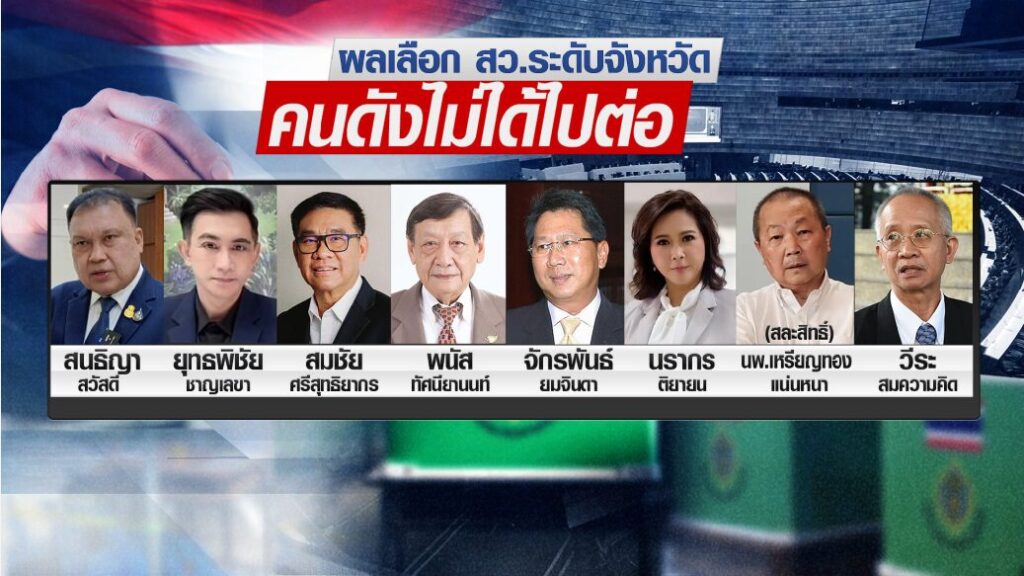 สรุปอีกครั้งในการเลือก สว.ระดับจังหวัด บรรดาคนดังที่ไม่ได้ไปต่อ เช่น นายสนธิญา สวัสดี อดีตที่ปรึกษากรรมาธิการการกฎหมายสภาผู้แทนราษฎร, นายสันธนะ ประยูรรัตน์, นายยุทธพิชัย ชาญเลขา อดีตนักแสดงชื่อดัง, นายสมชัย ศรีสุทธิยากร อดีต กกต., นายพนัส ทัศนียานนท์ อดีตอัยการและอดีตคณบดีคณะนิติศาสตร์ มหาวิทยาลัยธรรมศาสตร์, นายวีระ สมความคิด เลขาธิการเครือข่ายประชาชนต้านคอร์รัปชัน, นายจักรพันธุ์ ยมจินดา อดีตผู้ประกาศข่าวชื่อดัง, น.ส.นารากร ติยายน ผู้ประกาศข่าวชื่อดัง, และ นพ.เหรียญทอง แน่นหนา ซึ่งสละสิทธิ์ในการจับสลาก .-สำนักข่าวไทย