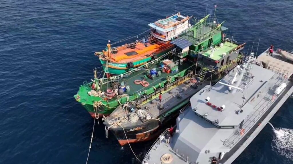 ภาพล่าสุดเรือของกลาง 3 ลำ ที่เจ้าหน้าที่ติดตามไปพบเมื่อวานนี้ (16 มิ.ย.) ลอยลำอยู่บริเวณพื้นที่ทับซ้อนทางทะเล ซึ่งเป็นเขตเศรษฐกิจพิเศษจำเพาะ 3 ประเทศ คือ ไทย กัมพูชา และเวียดนาม จากการตรวจสอบเบื้องต้นพบว่าน้ำมันในเรือบางส่วนหายไป อยู่ไม่เต็มจำนวน และลูกเรือจากจำนวน 16 คน ตอนนี้เหลือเพียง 8 คนเท่านั้น นอกจากนี้บริเวณตัวเรือยังพบว่ามีความพยายามที่จะอำพรางเปลี่ยนแปลงสีเรือด้วย