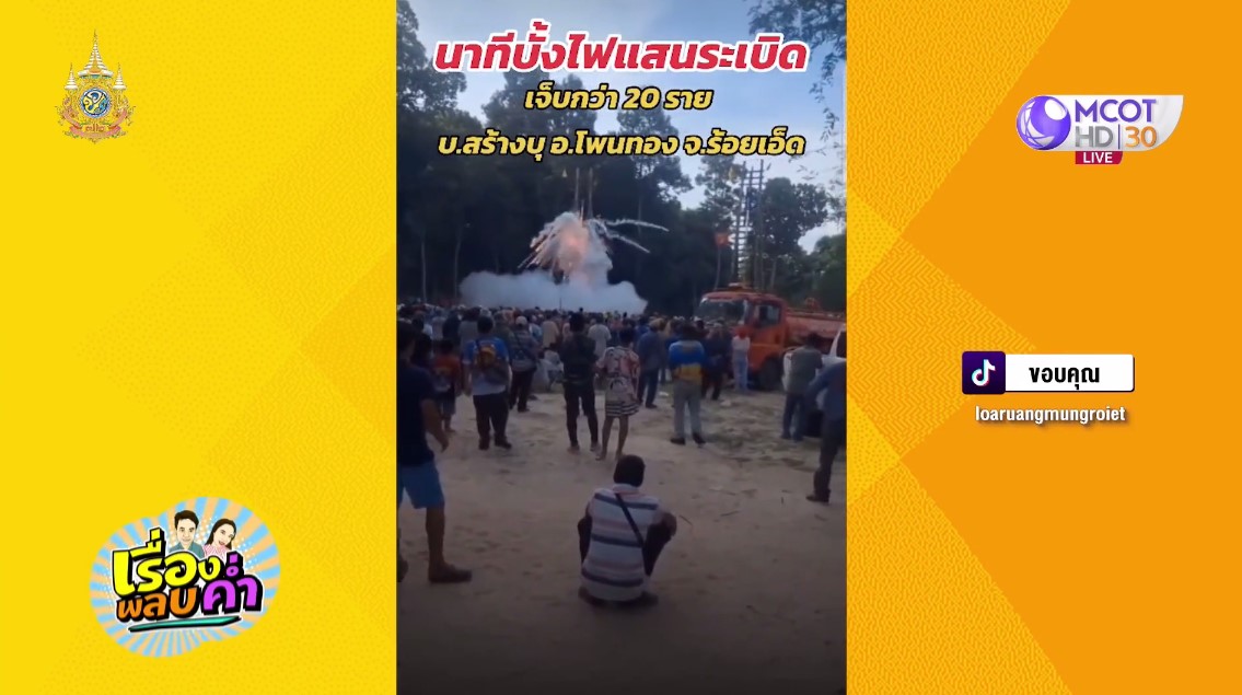 ร้อยเอ็ด 17 มิ.ย. – เหตุบั้งไฟระเบิดในงานประเพณีบั้งไฟแสนประจำปี บวงสรวงพระธาตุอุปมุง จ.ร้อยเอ็ด มีผู้บาดเจ็บ 37 คน ล่าสุดกลับบ้านได้แล้ว 23 คน ส่วนอีก 6 คน ยังน่าห่วง