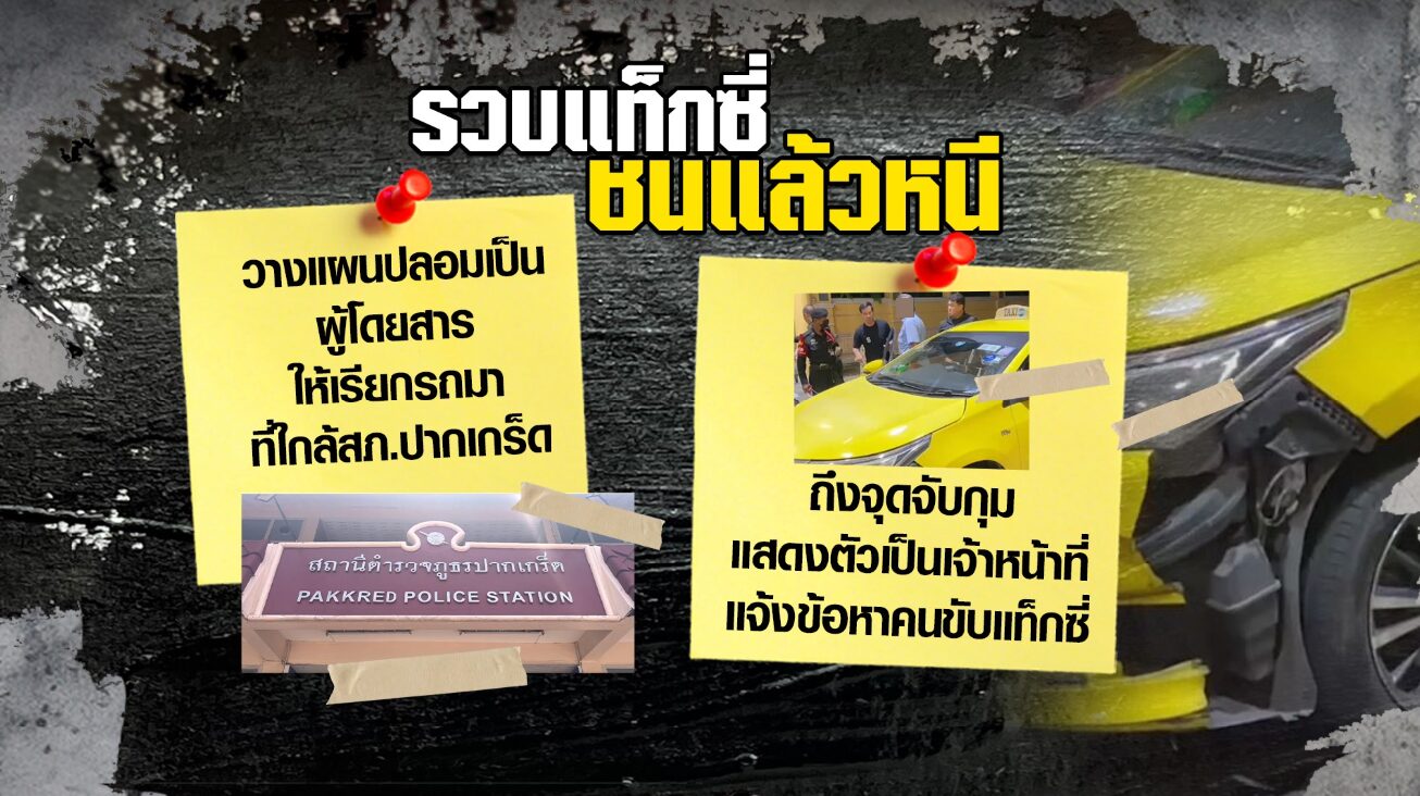 นนทบุรี 18 มิ.ย. – ซ้อนแผนจับคนขับแท็กซี่ชนแล้วหนี ตำรวจให้ผู้เสียหายปลอมเป็นผู้โดยสาร บอกคนขับให้มาส่งหน้าโรงพัก