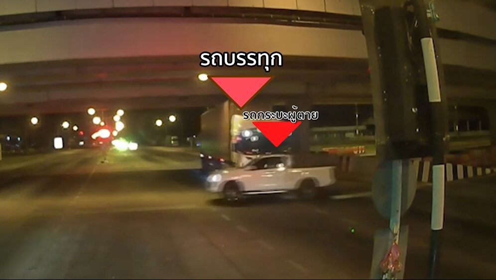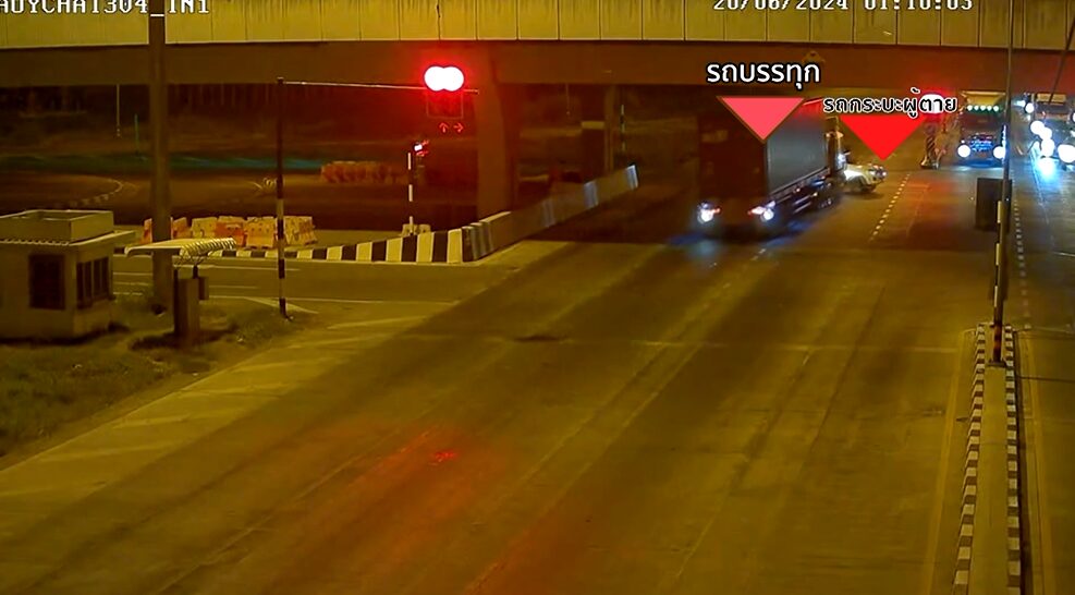 ภาพจากกล้องวงจรปิดบริเวณสี่แยกอวยชัย ถนนสาย 304 อำเภอปักธงชัย เมื่อช่วงเวลา 01.10 น. วันที่ 20 มิ.ย. จะเห็นเหตุการณ์ขณะเกิดอุบัติเหตุรถบรรทุกชนกับรถกระบะ โดยรถเทรลเลอร์ ที่มีนายฉัตรสรรชัย อายุ 27 ปี เป็นขันขับ กำลังจะนำยางพาราไปส่งยังจังหวัดชลบุรี ได้ฝ่าสัญญาณไฟแดง และชนเข้ากับกระบะสีขาว ที่กำลังขับข้ามแยกไฟแดงดังกล่าว จนรถกระเด็นไปกระแทกกับรถเทรลเลอร์อีกคันที่จอดติดไฟแดง ทำให้ จ.ส.ต.นพรัตน์ จรกระโทก ผบ.หมู่ สถานีตำรวจทางหลวง 1 กองกำกับการ 6 กองบังคับการตำรวจทางหลวง คนขับรถกระบะเสียชีวิตคาที่