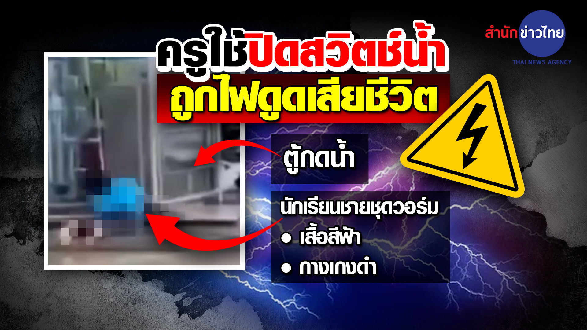 เป็นเหตุการณ์ที่สุดเศร้าและคงไม่อยากให้เกิดขึ้น นักเรียนชายคนหนึ่งสวมชุดวอร์ม กางเกงดำ เสื้อสีฟ้า ถูกกระแสไฟรั่วดูดนอนเสียชีวิตติดคาตู้ผลิตน้ำดื่มในโรงเรียนมัธยมแห่งหนึ่ง อ.กันตัง จ.ตรัง